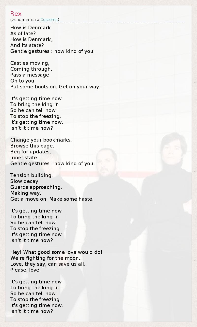 How is Denmark As of late? How is Denmark, And its state? Gentle gestures : how kind of you Castles moving, Coming through. Pass a message On to you. Put some boots on. Get on your way. It's getting time now To bring the king in So he can tell how To stop the freezing. It's getting time now. Isn't it time now? Change your bookmarks. Browse this page. Beg for updates, Inner state. Gentle gestures : how kind of you. Tension building, Slow decay. Guards approaching, Making way. Get a move on. Make some haste. It's getting time now To bring the king in So he can tell how To stop the freezing. It's getting time now. Isn't it time now? Hey! What good some love would do! We're fighting for the moon. Love, they say, can save us all. Please, love. It's getting time now To bring the king in So he can tell how To stop the freezing. It's getting time now. Isn't it time now?