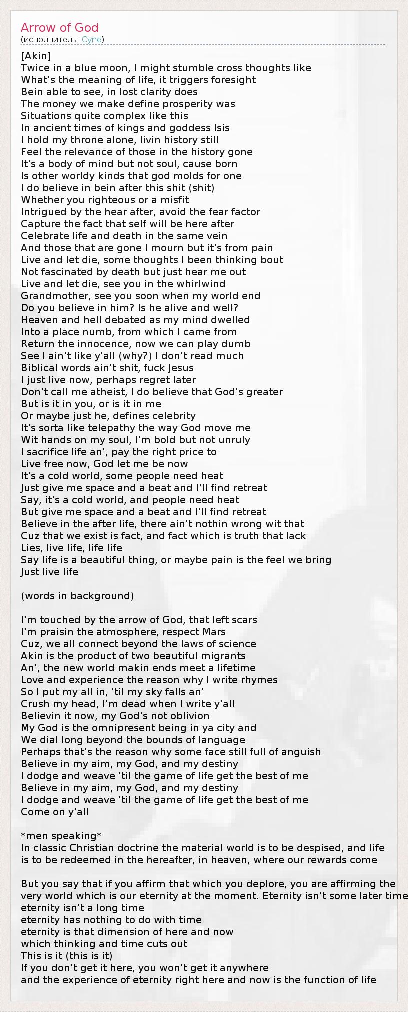 [Akin] Twice in a blue moon, I might stumble cross thoughts like What's the meaning of life, it triggers foresight Bein able to see, in lost clarity does The money we make define prosperity was Situations quite complex like this In ancient times of kings and goddess Isis I hold my throne alone, livin history still Feel the relevance of those in the history gone It's a body of mind but not soul, cause born Is other worldy kinds that god molds for one I do believe in bein after this shit (shit) Whether you righteous or a misfit Intrigued by the hear after, avoid the fear factor Capture the fact that self will be here after Celebrate life and death in the same vein And those that are gone I mourn but it's from pain Live and let die, some thoughts I been thinking bout Not fascinated by death but just hear me out Live and let die, see you in the whirlwind Grandmother, see you soon when my world end Do you believe in him? Is he alive and well? Heaven and hell debated as my mind dwelled Into a place numb, from which I came from Return the innocence, now we can play dumb See I ain't like y'all (why?) I don't read much Biblical words ain't shit, fuck Jesus I just live now, perhaps regret later Don't call me atheist, I do believe that God's greater But is it in you, or is it in me Or maybe just he, defines celebrity It's sorta like telepathy the way God move me Wit hands on my soul, I'm bold but not unruly I sacrifice life an', pay the right price to Live free now, God let me be now It's a cold world, some people need heat Just give me space and a beat and I'll find retreat Say, it's a cold world, and people need heat But give me space and a beat and I'll find retreat Believe in the after life, there ain't nothin wrong wit that Cuz that we exist is fact, and fact which is truth that lack Lies, live life, life life Say life is a beautiful thing, or maybe pain is the feel we bring Just live life (words in background) I'm touched by the arrow of God, that left scars I'm praisin the atmosphere, respect Mars Cuz, we all connect beyond the laws of science Akin is the product of two beautiful migrants An', the new world makin ends meet a lifetime Love and experience the reason why I write rhymes So I put my all in, 'til my sky falls an' Crush my head, I'm dead when I write y'all Believin it now, my God's not oblivion My God is the omnipresent being in ya city and We dial long beyond the bounds of language Perhaps that's the reason why some face still full of anguish Believe in my aim, my God, and my destiny I dodge and weave 'til the game of life get the best of me Believe in my aim, my God, and my destiny I dodge and weave 'til the game of life get the best of me Come on y'all *men speaking* In classic Christian doctrine the material world is to be despised, and life is to be redeemed in the hereafter, in heaven, where our rewards come But you say that if you affirm that which you deplore, you are affirming the very world which is our eternity at the moment. Eternity isn't some later time eternity isn't a long time eternity has nothing to do with time eternity is that dimension of here and now which thinking and time cuts out This is it (this is it) If you don't get it here, you won't get it anywhere and the experience of eternity right here and now is the function of life