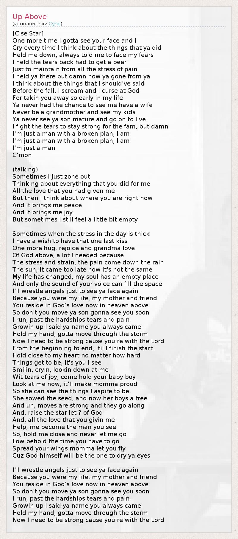 [Cise Star] One more time I gotta see your face and I Cry every time I think about the things that ya did Held me down, always told me to face my fears I held the tears back had to get a beer Just to maintain from all the stress of pain I held ya there but damn now ya gone from ya I think about the things that I should've said Before the fall, I scream and I curse at God For takin you away so early in my life Ya never had the chance to see me have a wife Never be a grandmother and see my kids Ya never see ya son mature and go on to live I fight the tears to stay strong for the fam, but damn I'm just a man with a broken plan, I am I'm just a man with a broken plan, I am I'm just a man C'mon (talking) Sometimes I just zone out Thinking about everything that you did for me All the love that you had given me But then I think about where you are right now And it brings me peace And it brings me joy But sometimes I still feel a little bit empty Sometimes when the stress in the day is thick I have a wish to have that one last kiss One more hug, rejoice and grandma love Of God above, a lot I needed because The stress and strain, the pain come down the rain The sun, it came too late now it's not the same My life has changed, my soul has an empty place And only the sound of your voice can fill the space I'll wrestle angels just to see ya face again Because you were my life, my mother and friend You reside in God's love now in heaven above So don't you move ya son gonna see you soon I run, past the hardships tears and pain Growin up I said ya name you always came Hold my hand, gotta move through the storm Now I need to be strong cause you're with the Lord From the beginning to end, 'til I finish the start Hold close to my heart no matter how hard Things get to be, it's you I see Smilin, cryin, lookin down at me Wit tears of joy, come hold your baby boy Look at me now, it'll make momma proud So she can see the things I aspire to be She sowed the seed, and now her boys a tree And uh, moves are strong and they go along And, raise the star let ? of God And, all the love that you givin me Help, me become the man you see So, hold me close and never let me go Low behold the time you have to go Spread your wings momma let you fly Cuz God himself will be the one to dry ya eyes I'll wrestle angels just to see ya face again Because you were my life, my mother and friend You reside in God's love now in heaven above So don't you move ya son gonna see you soon I run, past the hardships tears and pain Growin up I said ya name you always came Hold my hand, gotta move through the storm Now I need to be strong cause you're with the Lord