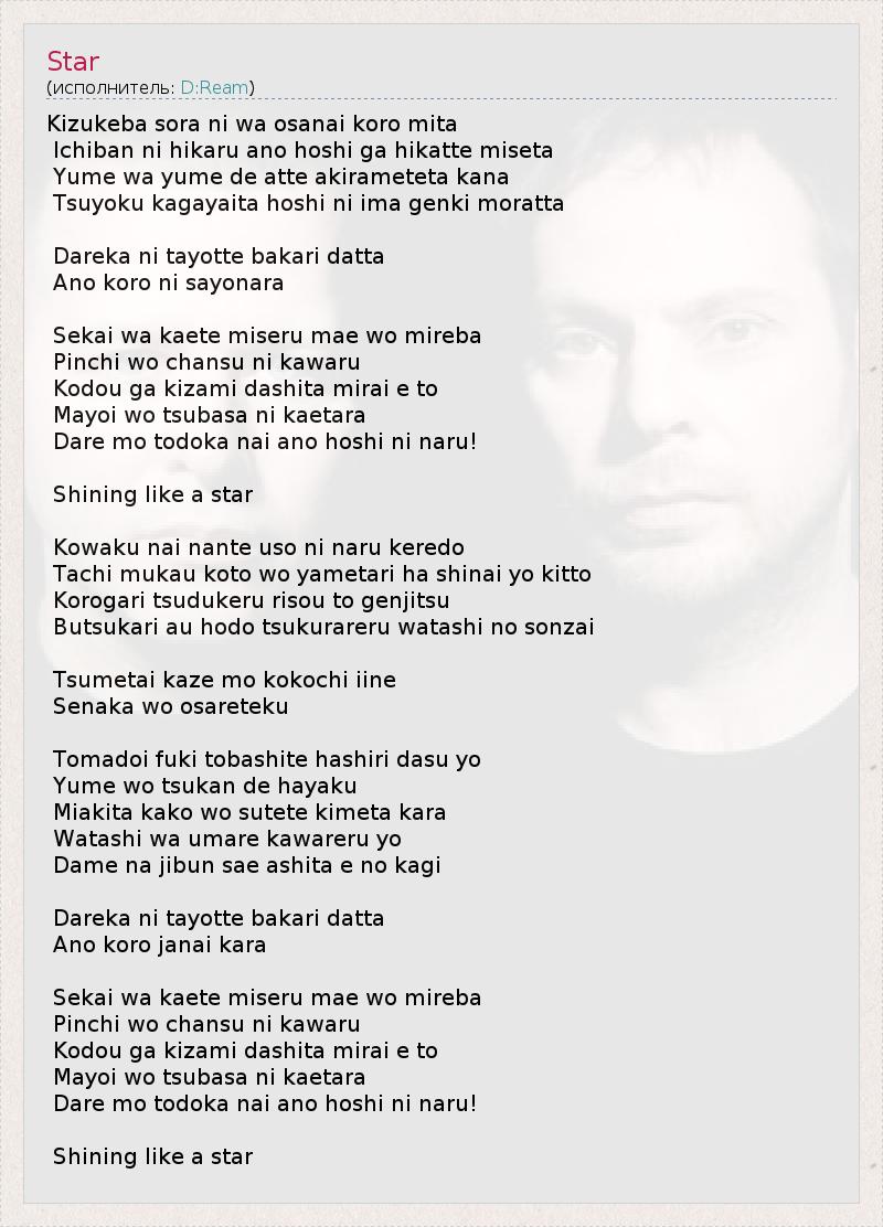 Kizukeba sora ni wa osanai koro mita Ichiban ni hikaru ano hoshi ga hikatte miseta Yume wa yume de atte akirameteta kana Tsuyoku kagayaita hoshi ni ima genki moratta Dareka ni tayotte bakari datta Ano koro ni sayonara Sekai wa kaete miseru mae wo mireba Pinchi wo chansu ni kawaru Kodou ga kizami dashita mirai e to Mayoi wo tsubasa ni kaetara Dare mo todoka nai ano hoshi ni naru! Shining like a star Kowaku nai nante uso ni naru keredo Tachi mukau koto wo yametari ha shinai yo kitto Korogari tsudukeru risou to genjitsu Butsukari au hodo tsukurareru watashi no sonzai Tsumetai kaze mo kokochi iine Senaka wo osareteku Tomadoi fuki tobashite hashiri dasu yo Yume wo tsukan de hayaku Miakita kako wo sutete kimeta kara Watashi wa umare kawareru yo Dame na jibun sae ashita e no kagi Dareka ni tayotte bakari datta Ano koro janai kara Sekai wa kaete miseru mae wo mireba Pinchi wo chansu ni kawaru Kodou ga kizami dashita mirai e to Mayoi wo tsubasa ni kaetara Dare mo todoka nai ano hoshi ni naru! Shining like a star