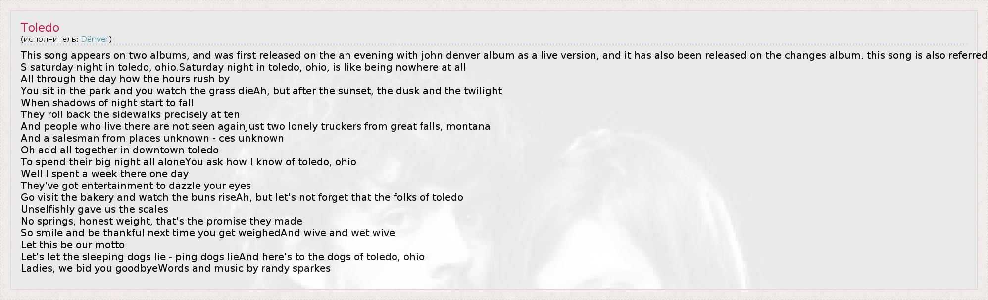 This song appears on two albums, and was first released on the an evening with john denver album as a live version, and it has also been released on the changes album. this song is also referred S saturday night in toledo, ohio.Saturday night in toledo, ohio, is like being nowhere at all All through the day how the hours rush by You sit in the park and you watch the grass dieAh, but after the sunset, the dusk and the twilight When shadows of night start to fall They roll back the sidewalks precisely at ten And people who live there are not seen againJust two lonely truckers from great falls, montana And a salesman from places unknown - ces unknown Oh add all together in downtown toledo To spend their big night all aloneYou ask how I know of toledo, ohio Well I spent a week there one day They've got entertainment to dazzle your eyes Go visit the bakery and watch the buns riseAh, but let's not forget that the folks of toledo Unselfishly gave us the scales No springs, honest weight, that's the promise they made So smile and be thankful next time you get weighedAnd wive and wet wive Let this be our motto Let's let the sleeping dogs lie - ping dogs lieAnd here's to the dogs of toledo, ohio Ladies, we bid you goodbyeWords and music by randy sparkes