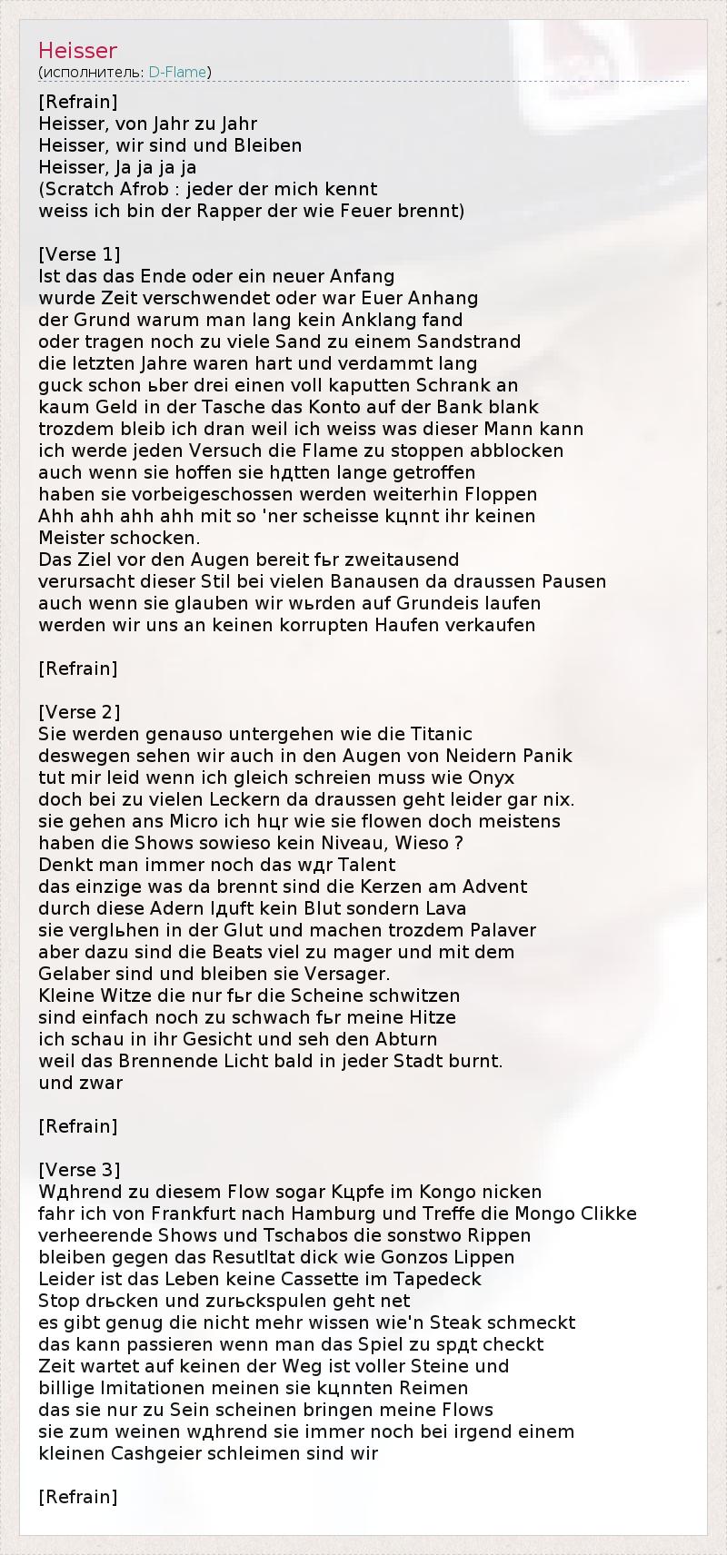 [Refrain] Heisser, von Jahr zu Jahr Heisser, wir sind und Bleiben Heisser, Ja ja ja ja (Scratch Afrob : jeder der mich kennt weiss ich bin der Rapper der wie Feuer brennt) [Verse 1] Ist das das Ende oder ein neuer Anfang wurde Zeit verschwendet oder war Euer Anhang der Grund warum man lang kein Anklang fand oder tragen noch zu viele Sand zu einem Sandstrand die letzten Jahre waren hart und verdammt lang guck schon ьber drei einen voll kaputten Schrank an kaum Geld in der Tasche das Konto auf der Bank blank trozdem bleib ich dran weil ich weiss was dieser Mann kann ich werde jeden Versuch die Flame zu stoppen abblocken auch wenn sie hoffen sie hдtten lange getroffen haben sie vorbeigeschossen werden weiterhin Floppen Ahh ahh ahh ahh mit so 'ner scheisse kцnnt ihr keinen Meister schocken. Das Ziel vor den Augen bereit fьr zweitausend verursacht dieser Stil bei vielen Banausen da draussen Pausen auch wenn sie glauben wir wьrden auf Grundeis laufen werden wir uns an keinen korrupten Haufen verkaufen [Refrain] [Verse 2] Sie werden genauso untergehen wie die Titanic deswegen sehen wir auch in den Augen von Neidern Panik tut mir leid wenn ich gleich schreien muss wie Onyx doch bei zu vielen Leckern da draussen geht leider gar nix. sie gehen ans Micro ich hцr wie sie flowen doch meistens haben die Shows sowieso kein Niveau, Wieso ? Denkt man immer noch das wдr Talent das einzige was da brennt sind die Kerzen am Advent durch diese Adern lдuft kein Blut sondern Lava sie verglьhen in der Glut und machen trozdem Palaver aber dazu sind die Beats viel zu mager und mit dem Gelaber sind und bleiben sie Versager. Kleine Witze die nur fьr die Scheine schwitzen sind einfach noch zu schwach fьr meine Hitze ich schau in ihr Gesicht und seh den Abturn weil das Brennende Licht bald in jeder Stadt burnt. und zwar [Refrain] [Verse 3] Wдhrend zu diesem Flow sogar Kцpfe im Kongo nicken fahr ich von Frankfurt nach Hamburg und Treffe die Mongo Clikke verheerende Shows und Tschabos die sonstwo Rippen bleiben gegen das Resutltat dick wie Gonzos Lippen Leider ist das Leben keine Cassette im Tapedeck Stop drьcken und zurьckspulen geht net es gibt genug die nicht mehr wissen wie'n Steak schmeckt das kann passieren wenn man das Spiel zu spдt checkt Zeit wartet auf keinen der Weg ist voller Steine und billige Imitationen meinen sie kцnnten Reimen das sie nur zu Sein scheinen bringen meine Flows sie zum weinen wдhrend sie immer noch bei irgend einem kleinen Cashgeier schleimen sind wir [Refrain]
