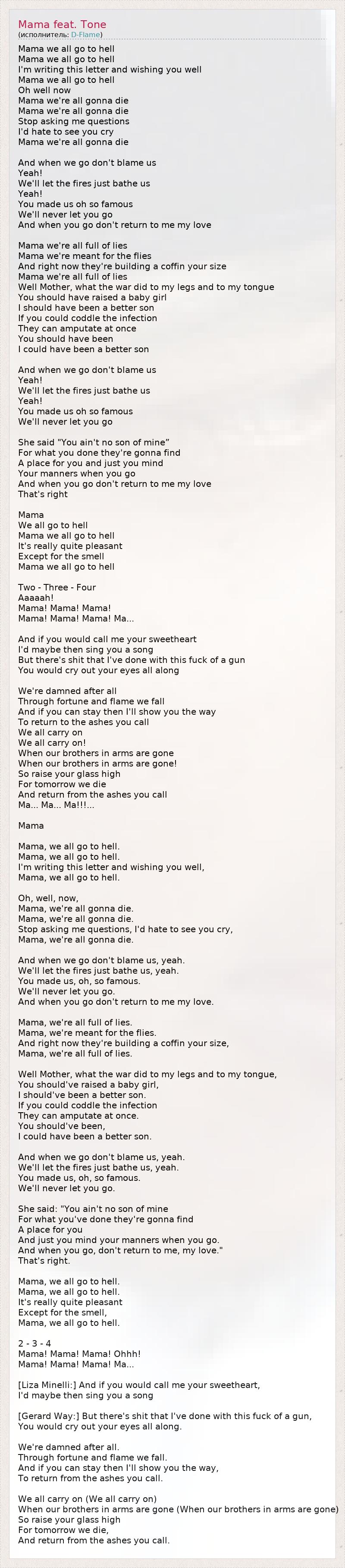 Мама, мы все попадём в ад Мама, мы все попадём в ад Я пишу это письмо и желаю тебе всего хорошего Мама, мы все попадём в ад А знаешь… Мама, мы все умрём Мама, мы все умрём Прекрати задавать мне вопросы Я ненавижу, когда ты плачешь Мама, мы все умрём И когда мы уйдём, не вини нас Эх! Мы просто позволим огню поглотить нас Э-эх! Ты та-а-ак прославила нас Мы никогда тебя не отпустим И когда ты уйдёшь, не возвращайся ко мне, любовь моя Мама, мы все полны лжи Мама, нас сожрут мухи И сейчас они сколачивают гроб твоего размера Мама, мы все полны лжи Ну, Мать, что же сделала война с моими ногами и моим языком! Ты должна была вырастить лапочку-дочку Я должен был быть лучшим сыном Если ты можешь вылечить меня и поставить на ноги Они просто могут сразу их ампутировать Ты должна была быть… Я мог бы быть лучшим сыном И когда мы уйдём, не вини нас Эх! Мы просто позволим огню поглотить нас Э-эх! Ты та-а-ак прославила нас Мы никогда тебя не отпустим Она сказала: «Ты не мой сын» Ради того, что ты сделала, они найдут Местечко и для тебя, И только ты запомнишь свои манеры, когда уйдёшь А когда уйдёшь, не возвращайся ко мне, любовь моя Да, именно так Мама, Мы все попадём в ад Мама, мы все попадём в ад! Это на самом деле довольно приятно За исключением запаха Мама, мы все попадём в ад Два-три-чтыре Аааааааааааааааааааааааа!!! Мама! Мама! Мама! Мама! Мама! Мама! Ма… И если ты позовёшь меня, свою ненаглядную Тогда, может быть, я спою тебе песенку Но что за хрень я натворил с этой грёбаной пушкой Ты всё время будешь обливаться слезами И, в конце концов, мы прокляты Мы прошли через беды и радости И если ты можешь остаться, я покажу тебе Путь к праху, к которому ты взываешь Мы все продолжаем своё дело Мы все продолжаем своё дело! Даже когда наши братья по оружию сгинули Даже когда наши братья по оружию сгинули! Так подними же бокал за то Что завтра мы умрём И восстанем из праха, к которому ты взывала Ма… Ма… Ма!!! Мама (перевод Дарьи Дрозд из Москвы) Мама,мы все канем в ад Мама,мы все канем в ад.. Пишу эти строки дрожащей рукой Мама,мне нужен покой. Напрасно, мама, ты ищешь меня Напрасно ждешь ты меня… Напрасно, не жги рану ты без огня. Мама, оставь ты меня Меня накроет ржавым крылом е… Огонь, и смерть заденет плечом ееа.. Отравит счастьем тишина, Отрежет крылья сна-а-а.. И, уходя, закрой дверь на-всег-да. Мама, мы ложью живем. Мы пьем, калечим и врём И роем себе мы могилу в земле Зовем на помощь в душе Война связала ноги и отрезала язык Ох, лучше б ты ростила дочку Я ведь к ласке не привык. Но если вылечишь ты рану, Они проткнут её опять. Ты не должна. Свой недуг сам я должен снять. Они бросают умирать На растерзанье своих же мыслей Закрыв глаза и у-уши на проклятых судьбой черве-е-ей. И, уходя закрой дверь навсегда-а-а-а. Мама, нас ждёт только ад. Где наши страхи горят. И пахнет паленым грехами скотом. Мама, в аду мы умрем. [Лайза Минели:] Я спою песню для тебя…