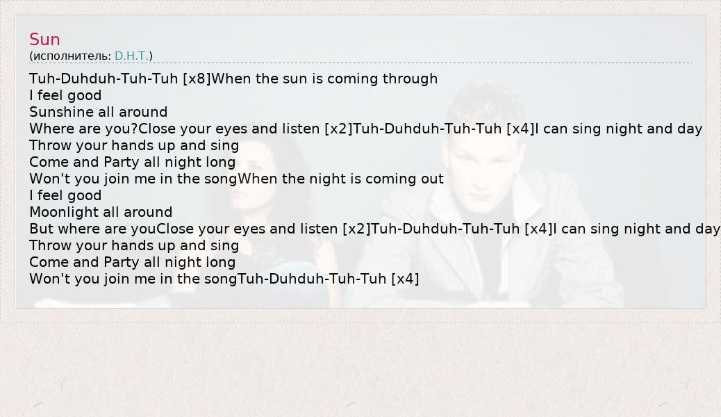 Это интересно:http://userserve-ak.last.fm/serve/_/67722016/DHT+_featuring_Edmee.jpg D.H.T. (муз. стиль: танцевальный, хаус, транс) бельгийский дуэт, в состав которого вошли певица Эдми Даэнен(фр. Edmée Daenen), (род. 25 марта 1985, Кортрейк, Бельгия) и главный продюсер, автор текстов и композитор Флор Тьюв(фр. Flor Theeuwes)(род. 28 августа 1976, Тюрнхаут, Бельгия) В 1995 году D.H.T. начала свой... продолжение