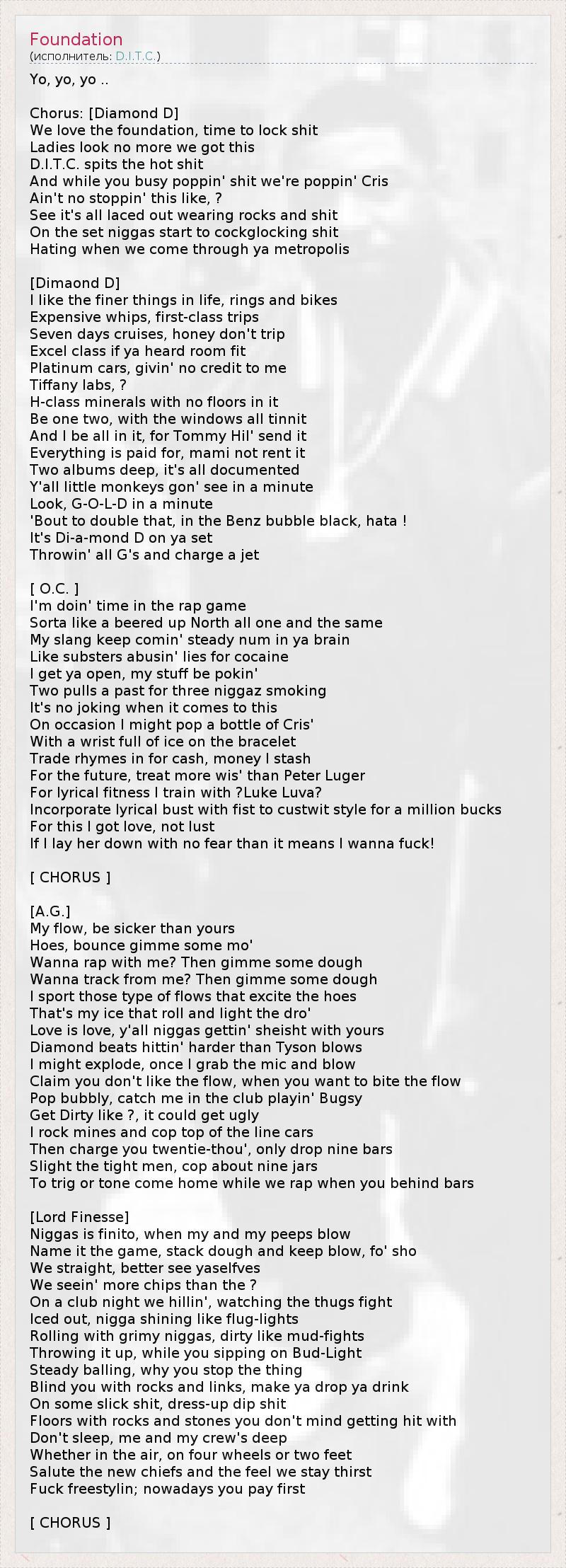Это интересно:D.I.T.C. (Diggin' In The Crates) андеграундная команда из Бронкса, которая берет свое начало с конца 80-х годов, куда вошли такие именитые МС и продюсеры восточного побережья как Fat Joe, Showbiz, A.G., Lord Finesse, Buckwild, O.C., Big L и Diamond D. Это ребята полностью отдающиеся настоящему рэпу с его реальным рифмованием и бит-ритмами.Каждый из этих рэперов не похож на другого, ни по манере читки ни по своему звучанию, поэтому... продолжение