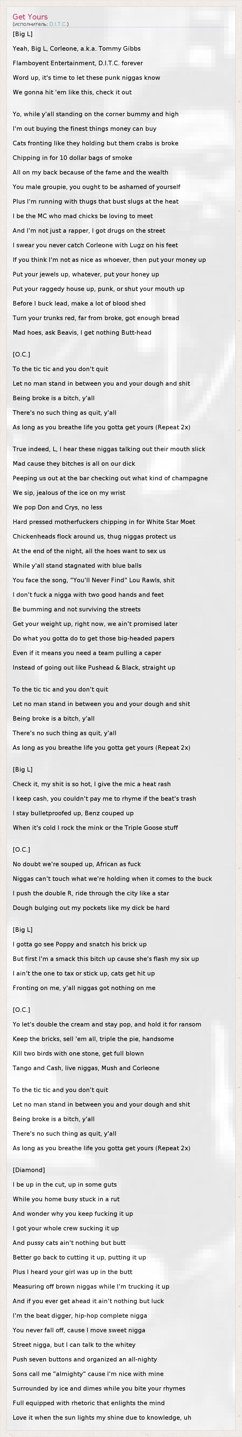 [Big L] Yeah, Big L, Corleone, a.k.a. Tommy Gibbs Flamboyent Entertainment, D.I.T.C. forever Word up, it's time to let these punk niggas know We gonna hit 'em like this, check it out Yo, while y'all standing on the corner bummy and high I'm out buying the finest things money can buy Cats fronting like they holding but them crabs is broke Chipping in for 10 dollar bags of smoke All on my back because of the fame and the wealth You male groupie, you ought to be ashamed of yourself Plus I'm running with thugs that bust slugs at the heat I be the MC who mad chicks be loving to meet And I'm not just a rapper, I got drugs on the street I swear you never catch Corleone with Lugz on his feet If you think I'm not as nice as whoever, then put your money up Put your jewels up, whatever, put your honey up Put your raggedy house up, punk, or shut your mouth up Before I buck lead, make a lot of blood shed Turn your trunks red, far from broke, got enough bread Mad hoes, ask Beavis, I get nothing Butt-head [O.C.] To the tic tic and you don't quit Let no man stand in between you and your dough and shit Being broke is a bitch, y'all There's no such thing as quit, y'all As long as you breathe life you gotta get yours (Repeat 2x) True indeed, L, I hear these niggas talking out their mouth slick Mad cause they bitches is all on our dick Peeping us out at the bar checking out what kind of champagne We sip, jealous of the ice on my wrist We pop Don and Crys, no less Hard pressed motherfuckers chipping in for White Star Moet Chickenheads flock around us, thug niggas protect us At the end of the night, all the hoes want to sex us While y'all stand stagnated with blue balls You face the song, "You'll Never Find" Lou Rawls, shit I don't fuck a nigga with two good hands and feet Be bumming and not surviving the streets Get your weight up, right now, we ain't promised later Do what you gotta do to get those big-headed papers Even if it means you need a team pulling a caper Instead of going out like Pushead & Black, straight up To the tic tic and you don't quit Let no man stand in between you and your dough and shit Being broke is a bitch, y'all There's no such thing as quit, y'all As long as you breathe life you gotta get yours (Repeat 2x) [Big L] Check it, my shit is so hot, I give the mic a heat rash I keep cash, you couldn't pay me to rhyme if the beat's trash I stay bulletproofed up, Benz couped up When it's cold I rock the mink or the Triple Goose stuff [O.C.] No doubt we're souped up, African as fuck Niggas can't touch what we're holding when it comes to the buck I push the double R, ride through the city like a star Dough bulging out my pockets like my dick be hard [Big L] I gotta go see Poppy and snatch his brick up But first I'm a smack this bitch up cause she's flash my six up I ain't the one to tax or stick up, cats get hit up Fronting on me, y'all niggas got nothing on me [O.C.] Yo let's double the cream and stay pop, and hold it for ransom Keep the bricks, sell 'em all, triple the pie, handsome Kill two birds with one stone, get full blown Tango and Cash, live niggas, Mush and Corleone To the tic tic and you don't quit Let no man stand in between you and your dough and shit Being broke is a bitch, y'all There's no such thing as quit, y'all As long as you breathe life you gotta get yours (Repeat 2x) [Diamond] I be up in the cut, up in some guts While you home busy stuck in a rut And wonder why you keep fucking it up I got your whole crew sucking it up And pussy cats ain't nothing but butt Better go back to cutting it up, putting it up Plus I heard your girl was up in the butt Measuring off brown niggas while I'm trucking it up And if you ever get ahead it ain't nothing but luck I'm the beat digger, hip-hop complete nigga You never fall off, cause I move sweet nigga Street nigga, but I can talk to the whitey Push seven buttons and organized an all-nighty Sons call me "almighty" cause I'm nice with mine Surrounded by ice and dimes while you bite your rhymes Full equipped with rhetoric that enlights the mind Love it when the sun lights my shine due to knowledge, uh