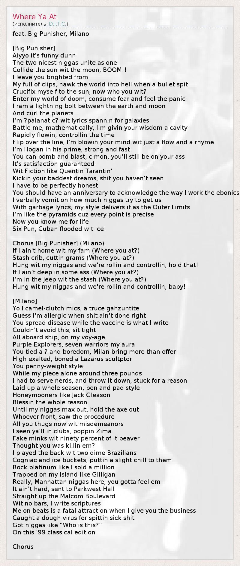 feat. Big Punisher, Milano [Big Punisher] Aiyyo it's funny dunn The two nicest niggas unite as one Collide the sun wit the moon, BOOM!! I leave you brighted from My full of clips, hawk the world into hell when a bullet spit Crucifix myself to the sun, now who you wit? Enter my world of doom, consume fear and feel the panic I ram a lightning bolt between the earth and moon And curl the planets I'm ?palanatic? wit lyrics spannin for galaxies Battle me, mathematically, I'm givin your wisdom a cavity Rapidly flowin, controllin the time Flip over the line, I'm blowin your mind wit just a flow and a rhyme I'm Hogan in his prime, strong and fast You can bomb and blast, c'mon, you'll still be on your ass It's satisfaction guaranteed Wit Fiction like Quentin Tarantin' Kickin your baddest dreams, shit you haven't seen I have to be perfectly honest You should have an anniversary to acknowledge the way I work the ebonics I verbally vomit on how much niggas try to get us With garbage lyrics, my style delivers it as the Outer Limits I'm like the pyramids cuz every point is precise Now you know me for life Six Pun, Cuban flooded wit ice Chorus [Big Punisher] (Milano) If I ain't home wit my fam (Where you at?) Stash crib, cuttin grams (Where you at?) Hung wit my niggas and we're rollin and controllin, hold that! If I ain't deep in some ass (Where you at?) I'm in the jeep wit the stash (Where you at?) Hung wit my niggas and we're rollin and controllin, baby! [Milano] Yo I camel-clutch mics, a truce gahzuntite Guess I'm allergic when shit ain't done right You spread disease while the vaccine is what I write Couldn't avoid this, sit tight All aboard ship, on my voy-age Purple Explorers, seven warriors my aura You tied a ? and boredom, Milan bring more than offer High exalted, boned a Lazarus scultptor You penny-weight style While my piece alone around three pounds I had to serve nerds, and throw it down, stuck for a reason Laid up a whole season, pen and pad style Honeymooners like Jack Gleason Blessin the whole reason Until my niggas max out, hold the axe out Whoever front, saw the procedure All you thugs now wit misdemeanors I seen ya'll in clubs, poppin Zima Fake minks wit ninety percent of it beaver Thought you was killin em? I played the back wit two dime Brazilians Cogniac and ice buckets, puttin a slight chill to them Rock platinum like I sold a million Trapped on my island like Gilligan Really, Manhattan niggas here, you gotta feel em It ain't hard, sent to Parkwest Hall Straight up the Malcom Boulevard Wit no bars, I write scriptures Me on beats is a fatal attraction when I give you the business Caught a dough virus for spittin sick shit Got niggas like "Who is this?" On this '99 classical edition Chorus