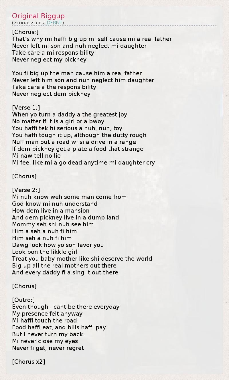 [Chorus:] That’s why mi haffi big up mi self cause mi a real father Never left mi son and nuh neglect mi daughter Take care a mi responsibility Never neglect my pickney You fi big up the man cause him a real father Never left him son and nuh neglect him daughter Take care a the responsibility Never neglect dem pickney [Verse 1:] When yo turn a daddy a the greatest joy No matter if it is a girl or a bwoy You haffi tek hi serious a nuh, nuh, toy You haffi tough it up, although the dutty rough Nuff man out a road wi si a drive in a range If dem pickney get a plate a food that strange Mi naw tell no lie Mi feel like mi a go dead anytime mi daughter cry [Chorus] [Verse 2:] Mi nuh know weh some man come from God know mi nuh understand How dem live in a mansion And dem pickney live in a dump land Mommy seh shi nuh see him Him a seh a nuh fi him Him seh a nuh fi him Dawg look how yo son favor you Look pon the likkle girl Treat you baby mother like shi deserve the world Big up all the real mothers out there And every daddy fi a sing it out there [Chorus] [Outro:] Even though I cant be there everyday My presence felt anyway Mi haffi touch the road Food haffi eat, and bills haffi pay But I never turn my back Mi never close my eyes Never fi get, never regret [Chorus x2]