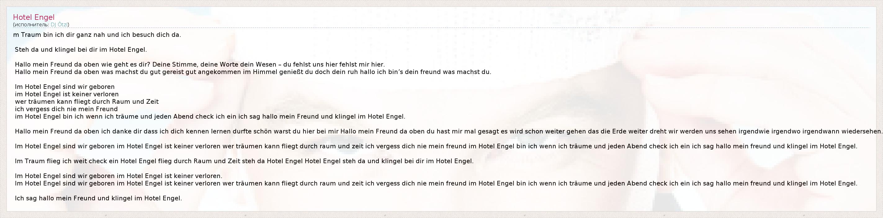 m Traum bin ich dir ganz nah und ich besuch dich da. Steh da und klingel bei dir im Hotel Engel. Hallo mein Freund da oben wie geht es dir? Deine Stimme, deine Worte dein Wesen – du fehlst uns hier fehlst mir hier. Hallo mein Freund da oben was machst du gut gereist gut angekommen im Himmel genießt du doch dein ruh hallo ich bin’s dein freund was machst du. Im Hotel Engel sind wir geboren im Hotel Engel ist keiner verloren wer träumen kann fliegt durch Raum und Zeit ich vergess dich nie mein Freund im Hotel Engel bin ich wenn ich träume und jeden Abend check ich ein ich sag hallo mein Freund und klingel im Hotel Engel. Hallo mein Freund da oben ich danke dir dass ich dich kennen lernen durfte schön warst du hier bei mir Hallo mein Freund da oben du hast mir mal gesagt es wird schon weiter gehen das die Erde weiter dreht wir werden uns sehen irgendwie irgendwo irgendwann wiedersehen. Im Hotel Engel sind wir geboren im Hotel Engel ist keiner verloren wer träumen kann fliegt durch raum und zeit ich vergess dich nie mein freund im Hotel Engel bin ich wenn ich träume und jeden Abend check ich ein ich sag hallo mein freund und klingel im Hotel Engel. Im Traum flieg ich weit check ein Hotel Engel flieg durch Raum und Zeit steh da Hotel Engel Hotel Engel steh da und klingel bei dir im Hotel Engel. Im Hotel Engel sind wir geboren im Hotel Engel ist keiner verloren. Im Hotel Engel sind wir geboren im Hotel Engel ist keiner verloren wer träumen kann fliegt durch raum und zeit ich vergess dich nie mein freund im Hotel Engel bin ich wenn ich träume und jeden Abend check ich ein ich sag hallo mein freund und klingel im Hotel Engel. Ich sag hallo mein Freund und klingel im Hotel Engel.