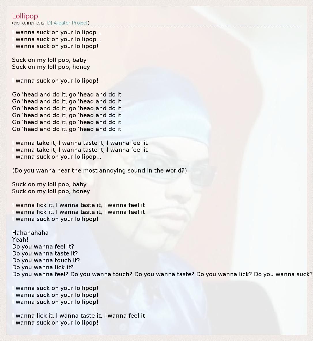 I wanna suck on your lollipop... I wanna suck on your lollipop... I wanna suck on your lollipop! Suck on my lollipop, baby Suck on my lollipop, honey I wanna suck on your lollipop! Go 'head and do it, go 'head and do it Go 'head and do it, go 'head and do it Go 'head and do it, go 'head and do it Go 'head and do it, go 'head and do it Go 'head and do it, go 'head and do it Go 'head and do it, go 'head and do it I wanna take it, I wanna taste it, I wanna feel it I wanna take it, I wanna taste it, I wanna feel it I wanna suck on your lollipop... (Do you wanna hear the most annoying sound in the world?) Suck on my lollipop, baby Suck on my lollipop, honey I wanna lick it, I wanna taste it, I wanna feel it I wanna lick it, I wanna taste it, I wanna feel it I wanna suck on your lollipop! Hahahahaha Yeah! Do you wanna feel it? Do you wanna taste it? Do you wanna touch it? Do you wanna lick it? Do you wanna feel? Do you wanna touch? Do you wanna taste? Do you wanna lick? Do you wanna suck? I wanna suck on your lollipop! I wanna suck on your lollipop! I wanna suck on your lollipop! I wanna lick it, I wanna taste it, I wanna feel it I wanna suck on your lollipop!