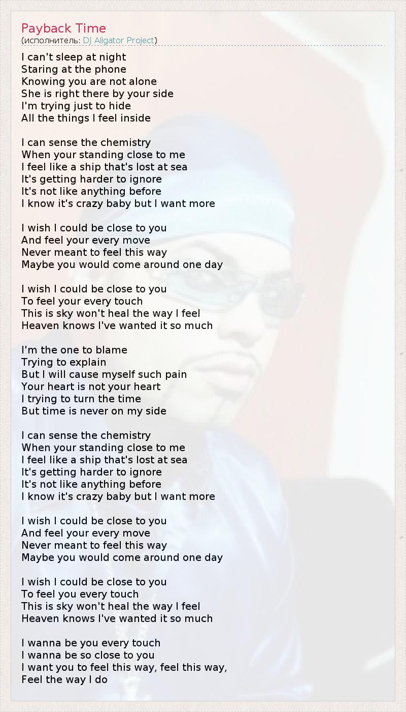 I can't sleep at night Staring at the phone Knowing you are not alone She is right there by your side I'm trying just to hide All the things I feel inside I can sense the chemistry When your standing close to me I feel like a ship that's lost at sea It's getting harder to ignore It's not like anything before I know it's crazy baby but I want more I wish I could be close to you And feel your every move Never meant to feel this way Maybe you would come around one day I wish I could be close to you To feel your every touch This is sky won't heal the way I feel Heaven knows I've wanted it so much I'm the one to blame Trying to explain But I will cause myself such pain Your heart is not your heart I trying to turn the time But time is never on my side I can sense the chemistry When your standing close to me I feel like a ship that's lost at sea It's getting harder to ignore It's not like anything before I know it's crazy baby but I want more I wish I could be close to you And feel your every move Never meant to feel this way Maybe you would come around one day I wish I could be close to you To feel you every touch This is sky won't heal the way I feel Heaven knows I've wanted it so much I wanna be you every touch I wanna be so close to you I want you to feel this way, feel this way, Feel the way I do