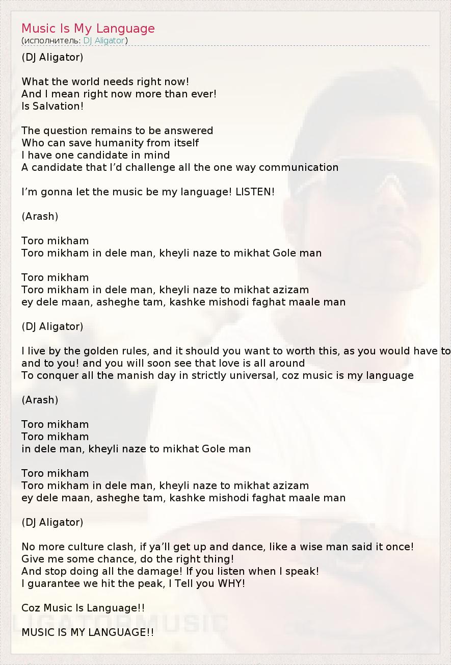 (DJ Aligator) What the world needs right now! And I mean right now more than ever! Is Salvation! The question remains to be answered Who can save humanity from itself I have one candidate in mind A candidate that I’d challenge all the one way communication I’m gonna let the music be my language! LISTEN! (Arash) Toro mikham Toro mikham in dele man, kheyli naze to mikhat Gole man Toro mikham Toro mikham in dele man, kheyli naze to mikhat azizam ey dele maan, asheghe tam, kashke mishodi faghat maale man (DJ Aligator) I live by the golden rules, and it should you want to worth this, as you would have to and to you! and you will soon see that love is all around To conquer all the manish day in strictly universal, coz music is my language (Arash) Toro mikham Toro mikham in dele man, kheyli naze to mikhat Gole man Toro mikham Toro mikham in dele man, kheyli naze to mikhat azizam ey dele maan, asheghe tam, kashke mishodi faghat maale man (DJ Aligator) No more culture clash, if ya’ll get up and dance, like a wise man said it once! Give me some chance, do the right thing! And stop doing all the damage! If you listen when I speak! I guarantee we hit the peak, I Tell you WHY! Coz Music Is Language!! MUSIC IS MY LANGUAGE!!