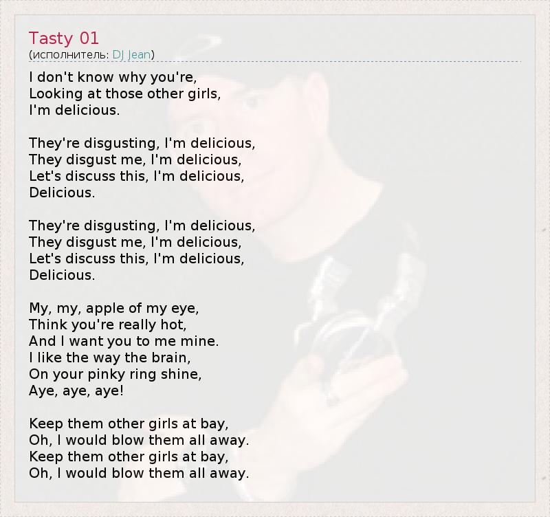 I don't know why you're, Looking at those other girls, I'm delicious. They're disgusting, I'm delicious, They disgust me, I'm delicious, Let's discuss this, I'm delicious, Delicious. They're disgusting, I'm delicious, They disgust me, I'm delicious, Let's discuss this, I'm delicious, Delicious. My, my, apple of my eye, Think you're really hot, And I want you to me mine. I like the way the brain, On your pinky ring shine, Aye, aye, aye! Keep them other girls at bay, Oh, I would blow them all away. Keep them other girls at bay, Oh, I would blow them all away.