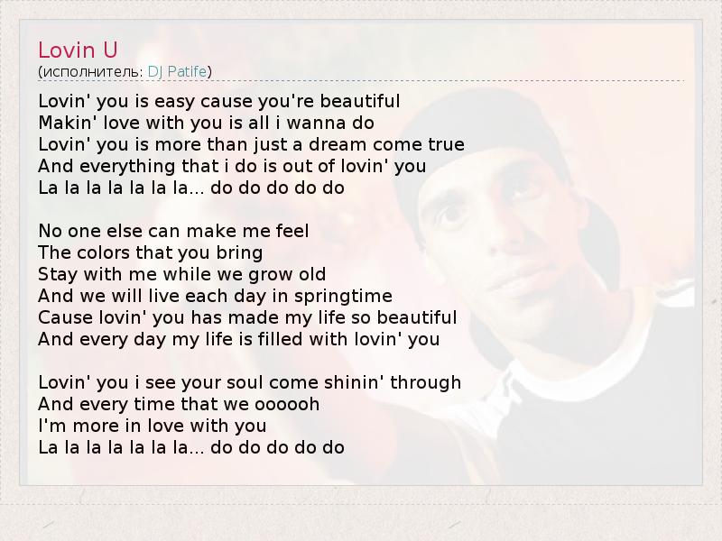 Lovin' you is easy cause you're beautiful Makin' love with you is all i wanna do Lovin' you is more than just a dream come true And everything that i do is out of lovin' you La la la la la la la... do do do do do No one else can make me feel The colors that you bring Stay with me while we grow old And we will live each day in springtime Cause lovin' you has made my life so beautiful And every day my life is filled with lovin' you Lovin' you i see your soul come shinin' through And every time that we oooooh I'm more in love with you La la la la la la la... do do do do do
