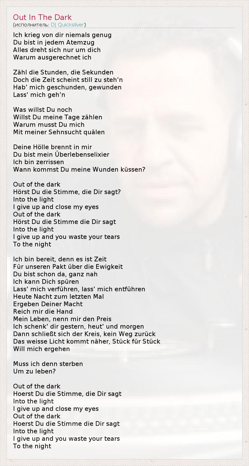 Ich krieg von dir niemals genug Du bist in jedem Atemzug Alles dreht sich nur um dich Warum ausgerechnet ich Zähl die Stunden, die Sekunden Doch die Zeit scheint still zu steh'n Hab' mich geschunden, gewunden Lass' mich geh'n Was willst Du noch Willst Du meine Tage zählen Warum musst Du mich Mit meiner Sehnsucht quälen Deine Hölle brennt in mir Du bist mein Überlebenselixier Ich bin zerrissen Wann kommst Du meine Wunden küssen? Out of the dark Hörst Du die Stimme, die Dir sagt? Into the light I give up and close my eyes Out of the dark Hörst Du die Stimme die Dir sagt Into the light I give up and you waste your tears To the night Ich bin bereit, denn es ist Zeit Für unseren Pakt über die Ewigkeit Du bist schon da, ganz nah Ich kann Dich spüren Lass' mich verführen, lass' mich entführen Heute Nacht zum letzten Mal Ergeben Deiner Macht Reich mir die Hand Mein Leben, nenn mir den Preis Ich schenk' dir gestern, heut' und morgen Dann schließt sich der Kreis, kein Weg zurück Das weisse Licht kommt näher, Stück für Stück Will mich ergehen Muss ich denn sterben Um zu leben? Out of the dark Hoerst Du die Stimme, die Dir sagt Into the light I give up and close my eyes Out of the dark Hoerst Du die Stimme die Dir sagt Into the light I give up and you waste your tears To the night