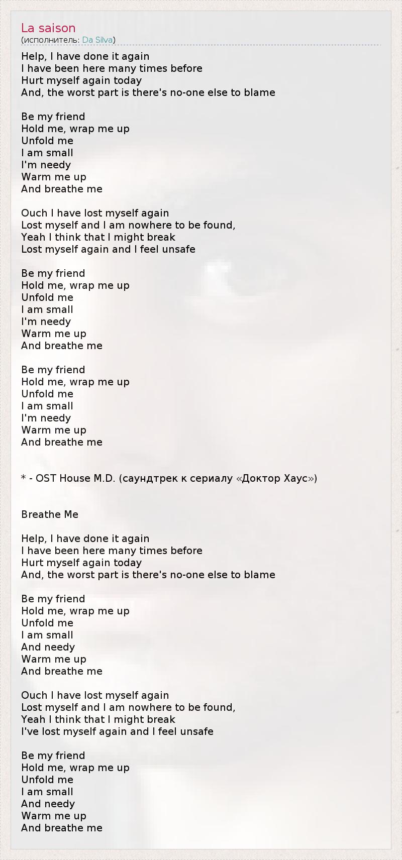 Help, I have done it again I have been here many times before Hurt myself again today And, the worst part is there's no-one else to blame Be my friend Hold me, wrap me up Unfold me I am small I'm needy Warm me up And breathe me Ouch I have lost myself again Lost myself and I am nowhere to be found, Yeah I think that I might break Lost myself again and I feel unsafe Be my friend Hold me, wrap me up Unfold me I am small I'm needy Warm me up And breathe me Be my friend Hold me, wrap me up Unfold me I am small I'm needy Warm me up And breathe me * - OST House M.D. (саундтрек к сериалу «Доктор Хаус») Breathe Me Help, I have done it again I have been here many times before Hurt myself again today And, the worst part is there's no-one else to blame Be my friend Hold me, wrap me up Unfold me I am small And needy Warm me up And breathe me Ouch I have lost myself again Lost myself and I am nowhere to be found, Yeah I think that I might break I've lost myself again and I feel unsafe Be my friend Hold me, wrap me up Unfold me I am small And needy Warm me up And breathe me