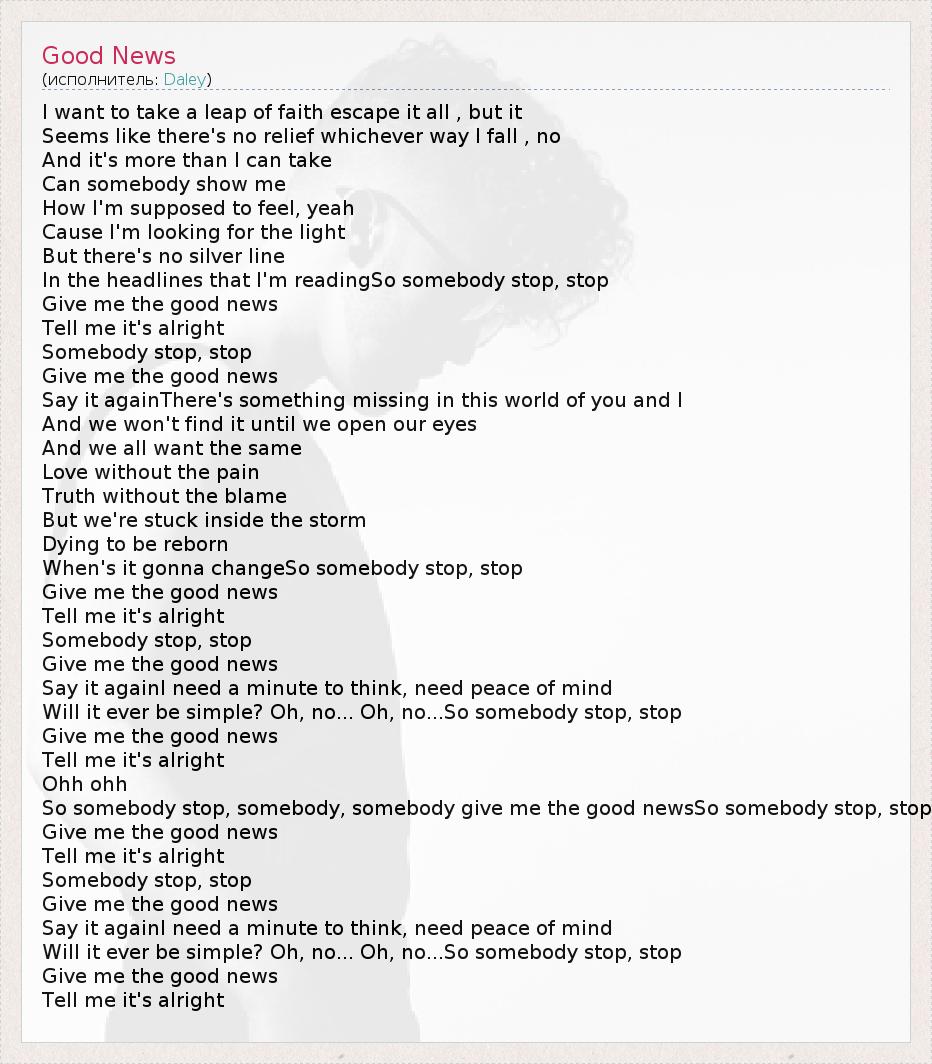 I want to take a leap of faith escape it all , but it Seems like there's no relief whichever way I fall , no And it's more than I can take Can somebody show me How I'm supposed to feel, yeah Cause I'm looking for the light But there's no silver line In the headlines that I'm readingSo somebody stop, stop Give me the good news Tell me it's alright Somebody stop, stop Give me the good news Say it againThere's something missing in this world of you and I And we won't find it until we open our eyes And we all want the same Love without the pain Truth without the blame But we're stuck inside the storm Dying to be reborn When's it gonna changeSo somebody stop, stop Give me the good news Tell me it's alright Somebody stop, stop Give me the good news Say it againI need a minute to think, need peace of mind Will it ever be simple? Oh, no... Oh, no...So somebody stop, stop Give me the good news Tell me it's alright Ohh ohh So somebody stop, somebody, somebody give me the good newsSo somebody stop, stop Give me the good news Tell me it's alright Somebody stop, stop Give me the good news Say it againI need a minute to think, need peace of mind Will it ever be simple? Oh, no... Oh, no...So somebody stop, stop Give me the good news Tell me it's alright