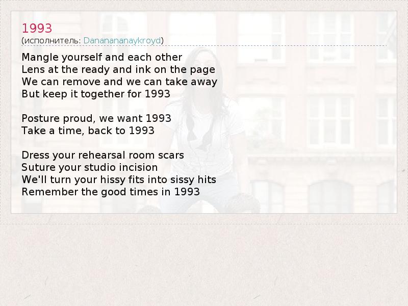 Mangle yourself and each other Lens at the ready and ink on the page We can remove and we can take away But keep it together for 1993 Posture proud, we want 1993 Take a time, back to 1993 Dress your rehearsal room scars Suture your studio incision We'll turn your hissy fits into sissy hits Remember the good times in 1993