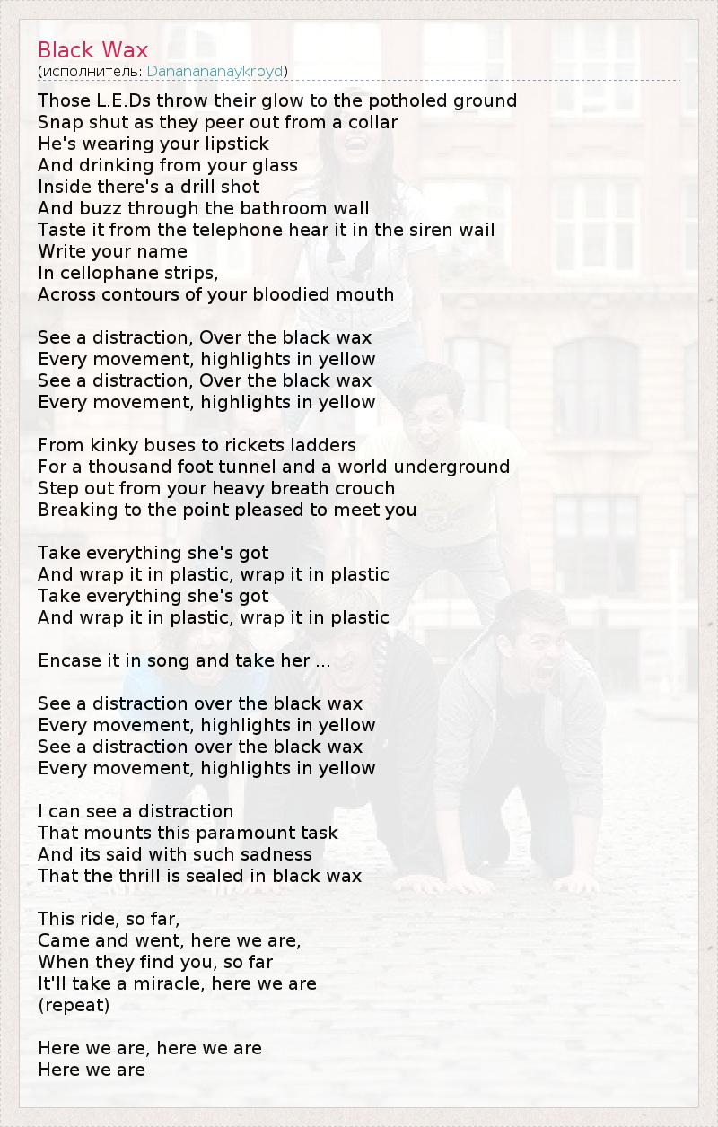 Those L.E.Ds throw their glow to the potholed ground Snap shut as they peer out from a collar He's wearing your lipstick And drinking from your glass Inside there's a drill shot And buzz through the bathroom wall Taste it from the telephone hear it in the siren wail Write your name In cellophane strips, Across contours of your bloodied mouth See a distraction, Over the black wax Every movement, highlights in yellow See a distraction, Over the black wax Every movement, highlights in yellow From kinky buses to rickets ladders For a thousand foot tunnel and a world underground Step out from your heavy breath crouch Breaking to the point pleased to meet you Take everything she's got And wrap it in plastic, wrap it in plastic Take everything she's got And wrap it in plastic, wrap it in plastic Encase it in song and take her ... See a distraction over the black wax Every movement, highlights in yellow See a distraction over the black wax Every movement, highlights in yellow I can see a distraction That mounts this paramount task And its said with such sadness That the thrill is sealed in black wax This ride, so far, Came and went, here we are, When they find you, so far It'll take a miracle, here we are (repeat) Here we are, here we are Here we are