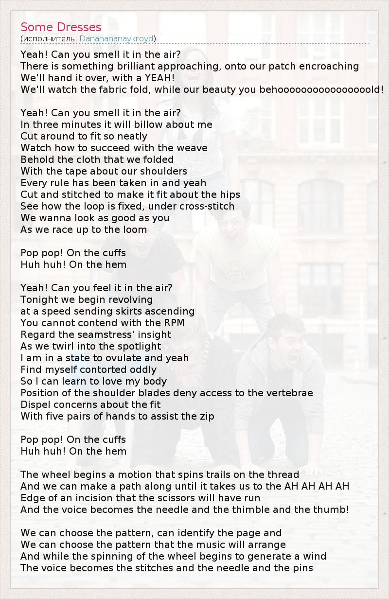 Yeah! Can you smell it in the air? There is something brilliant approaching, onto our patch encroaching We'll hand it over, with a YEAH! We'll watch the fabric fold, while our beauty you behoooooooooooooooold! Yeah! Can you smell it in the air? In three minutes it will billow about me Cut around to fit so neatly Watch how to succeed with the weave Behold the cloth that we folded With the tape about our shoulders Every rule has been taken in and yeah Cut and stitched to make it fit about the hips See how the loop is fixed, under cross-stitch We wanna look as good as you As we race up to the loom Pop pop! On the cuffs Huh huh! On the hem Yeah! Can you feel it in the air? Tonight we begin revolving at a speed sending skirts ascending You cannot contend with the RPM Regard the seamstress' insight As we twirl into the spotlight I am in a state to ovulate and yeah Find myself contorted oddly So I can learn to love my body Position of the shoulder blades deny access to the vertebrae Dispel concerns about the fit With five pairs of hands to assist the zip Pop pop! On the cuffs Huh huh! On the hem The wheel begins a motion that spins trails on the thread And we can make a path along until it takes us to the AH AH AH AH Edge of an incision that the scissors will have run And the voice becomes the needle and the thimble and the thumb! We can choose the pattern, can identify the page and We can choose the pattern that the music will arrange And while the spinning of the wheel begins to generate a wind The voice becomes the stitches and the needle and the pins