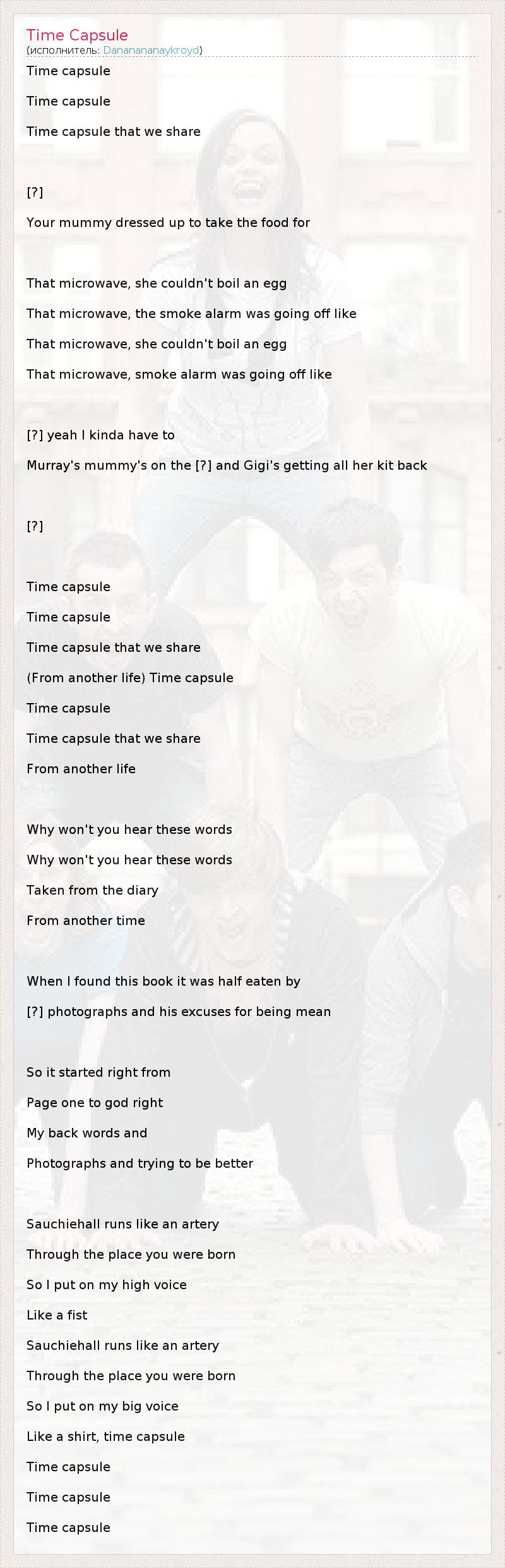Time capsule Time capsule Time capsule that we share [?] Your mummy dressed up to take the food for That microwave, she couldn't boil an egg That microwave, the smoke alarm was going off like That microwave, she couldn't boil an egg That microwave, smoke alarm was going off like [?] yeah I kinda have to Murray's mummy's on the [?] and Gigi's getting all her kit back [?] Time capsule Time capsule Time capsule that we share (From another life) Time capsule Time capsule Time capsule that we share From another life Why won't you hear these words Why won't you hear these words Taken from the diary From another time When I found this book it was half eaten by [?] photographs and his excuses for being mean So it started right from Page one to god right My back words and Photographs and trying to be better Sauchiehall runs like an artery Through the place you were born So I put on my high voice Like a fist Sauchiehall runs like an artery Through the place you were born So I put on my big voice Like a shirt, time capsule Time capsule Time capsule Time capsule