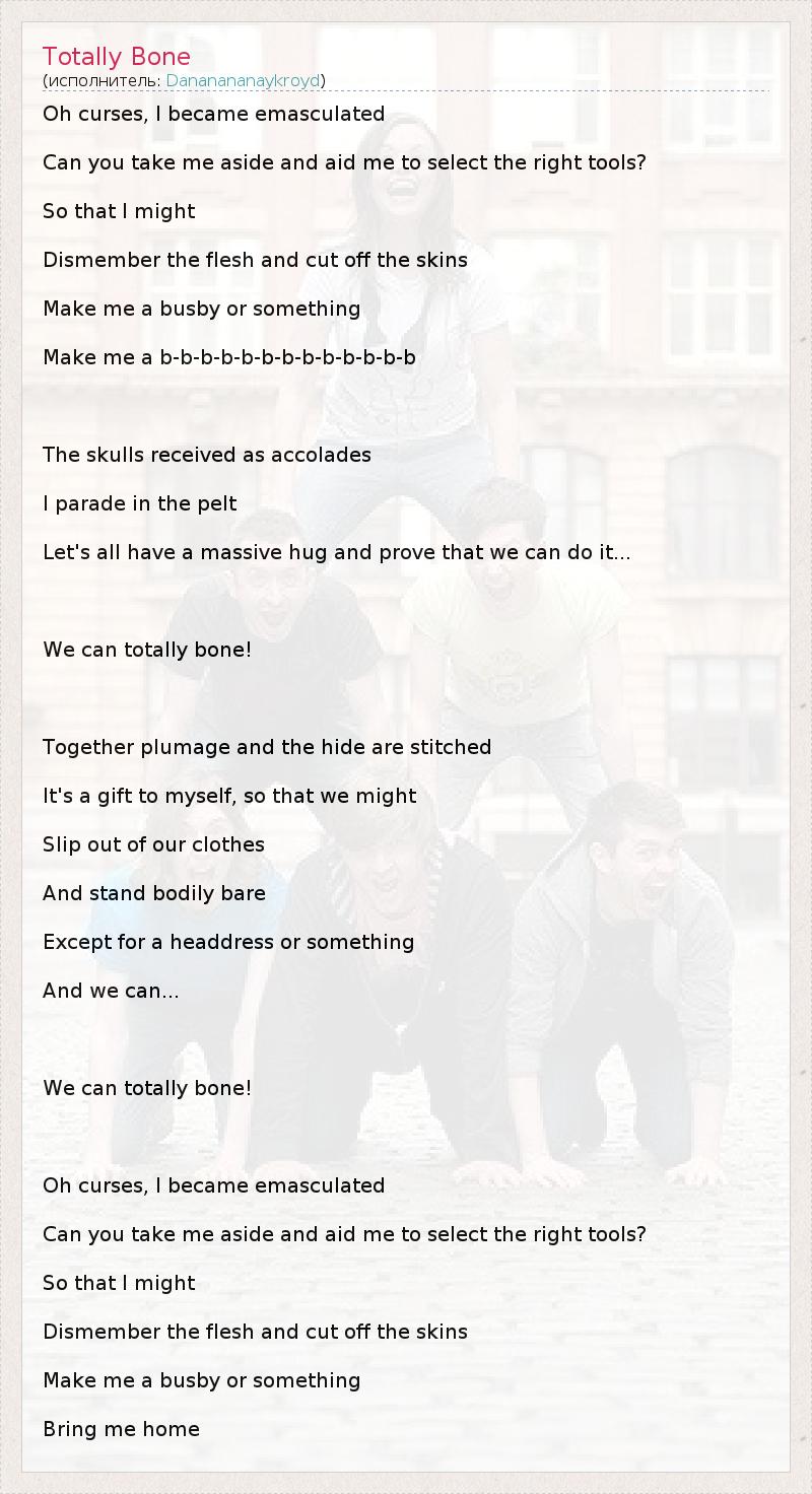 Oh curses, I became emasculated Can you take me aside and aid me to select the right tools? So that I might Dismember the flesh and cut off the skins Make me a busby or something Make me a b-b-b-b-b-b-b-b-b-b-b-b-b The skulls received as accolades I parade in the pelt Let's all have a massive hug and prove that we can do it... We can totally bone! Together plumage and the hide are stitched It's a gift to myself, so that we might Slip out of our clothes And stand bodily bare Except for a headdress or something And we can... We can totally bone! Oh curses, I became emasculated Can you take me aside and aid me to select the right tools? So that I might Dismember the flesh and cut off the skins Make me a busby or something Bring me home