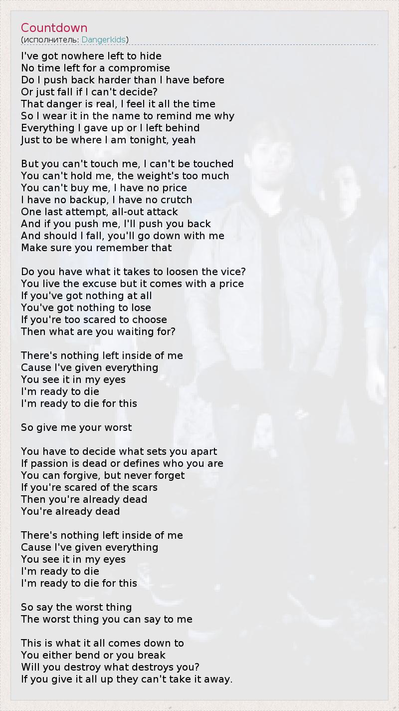 Это интересно:Dangerkids - американская рок группа из Дэйтона, штат Огайо, сформировавшаяся в 2012 году. В настоящее время группа состоит из пяти участников: Andy Bane, Tyler Smith, Jake Bryant, Jake Bonham и Katie Cole. Релиз первой песни состоялся 27го апреля. 7 июля состоялось первое выступление группы в Newport Music Hall. Группа выпустила четыре сингла: Waking up, Countdown, Light Escapes и We're All in Danger.