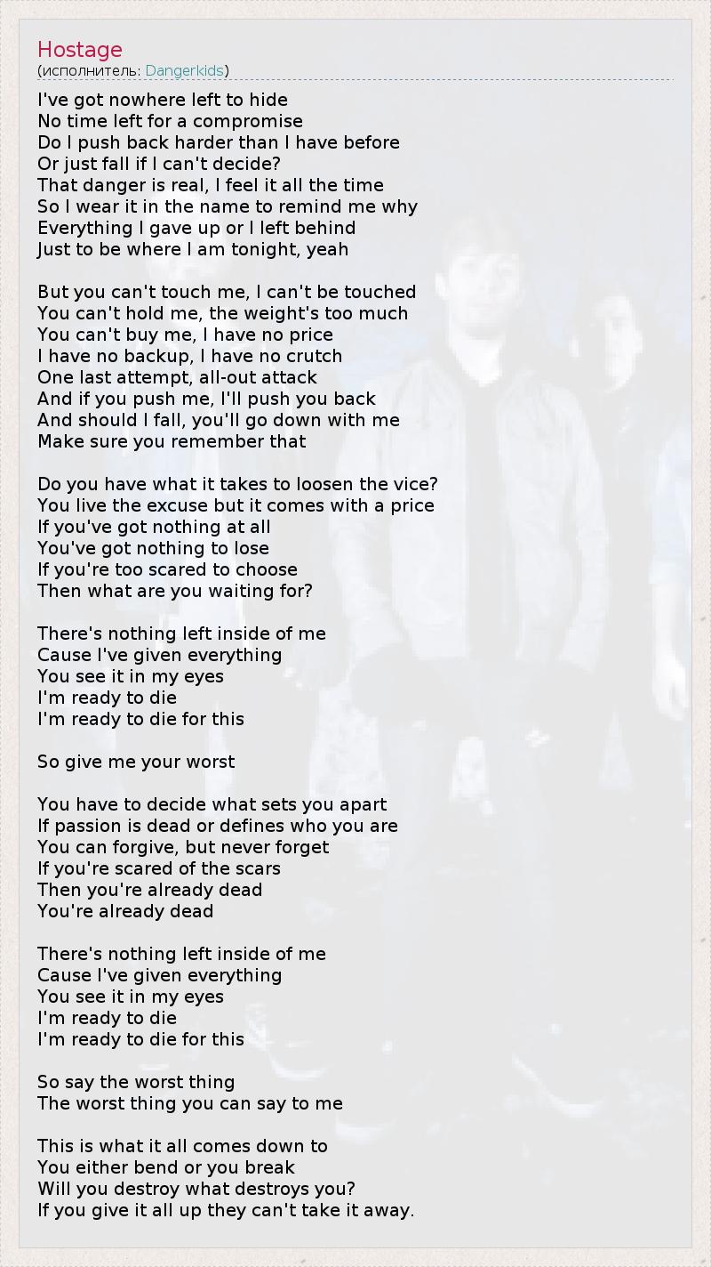 Мне негде больше прятаться, Не осталось времени для компромиссов. Буду ли я сопротивляться сильнее, чем раньше, Или просто упаду, если не смогу решиться? Эта опасность реальна, я чувствую ее постоянно, И я ношу это имя, 1 чтобы напоминать себе, почему, Все, что я оставил позади и от чего отказался, Только чтобы быть там, где я есть сейчас, да! Но ты не сможешь прикоснуться ко мне, я неприкосновенный, Ты не сможешь удержать меня, мой вес слишком велик. Ты не сможешь купить меня, я бесценный. У меня нет поддержки, у меня нет опоры. Одна последняя попытка, решительное наступление, И если ты окажешь давление, я окажу сопротивление. И если я упаду, ты упадешь вместе со мной, Постарайся это запомнить. Хватит ли у тебя сил, чтобы ослабить тиски? Ты живешь отговорками, но за это приходится платить. Если у тебя нет совсем ничего, Тебе нечего терять. Если ты испытываешь страх перед выбором, Тогда чего ты ждешь? У меня внутри ничего не осталось, Потому что я все отдал. Ты это видишь в моих глазах, Я готов умереть, Я готов умереть за это! Так устрой мне самое худшее, что ты можешь! Тебе нужно решить, что отличает тебя от других, Мертва ли страсть, или она определяет твою суть? Ты можешь простить, но забыть – никогда. Если ты боишься шрамов, Значит, ты уже мертв. Ты уже мертв! У меня внутри ничего не осталось, Потому что я все отдал. Ты видишь в моих глазах, Я готов умереть, Я готов умереть за это! Так скажи самое худшее, Самое худшее, что ты можешь мне сказать. И вот к чему все сводится, Ты либо согнешься, либо сломаешься. Разрушишь ли ты то, что разрушает тебя? Если ты откажешься от всего, они не смогут это отнять. 1 - Слово "danger" присутствует в названии группы Dangerkids