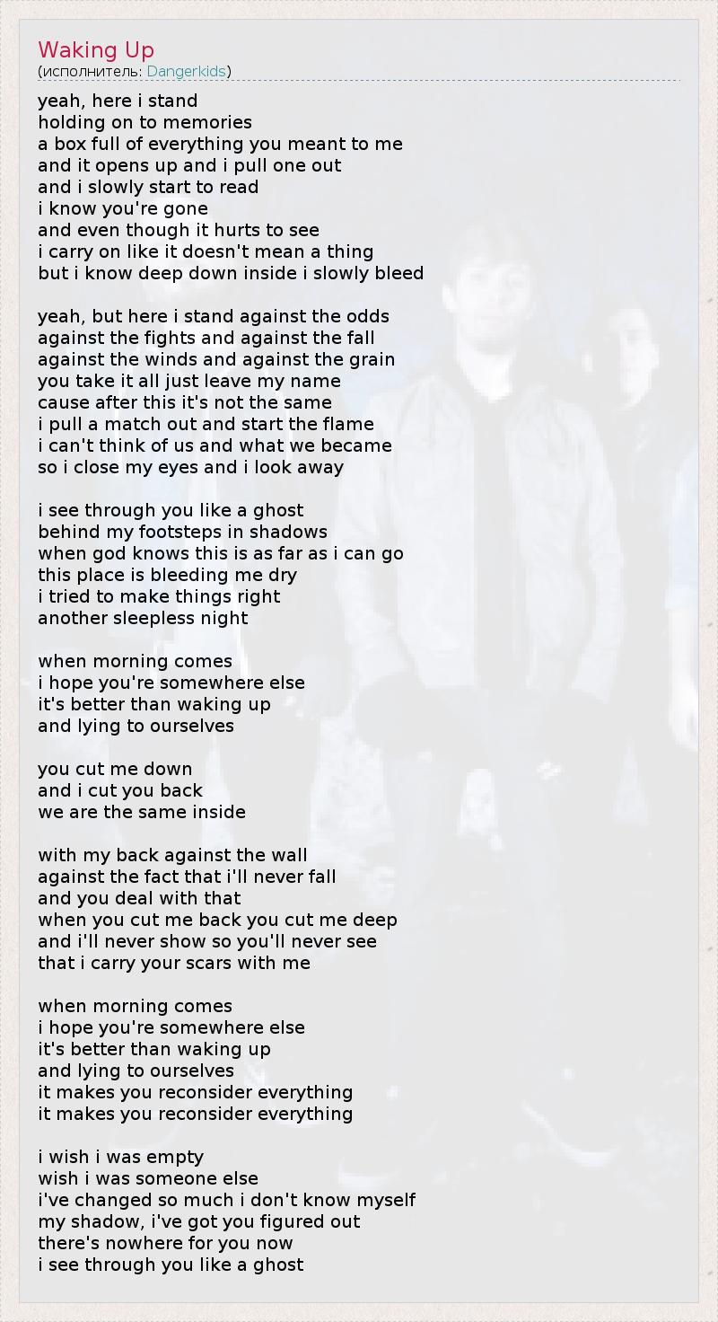 да, вот я стою держась за воспоминания коробка, полная все, что вы для меня значит и это открывает и я тянуть одного из них и я медленно начинаю читать я знаю, что ты ушел и даже при том, что это больно , чтобы увидеть я вести, как это не значит, вещь но я знаю, в глубине души я медленно кровоточить да, но вот я стою несмотря ни на что против боев и против падения против ветра и против зерна вы берете все это просто оставьте свое имя вызвать после этого это не то же самое я тянуть спичку и начать пламя я не могу думать о нас, и то, что мы стали поэтому я закрываю глаза , и я отвернуться я вижу через тебя, как призрак за моим стопам в тени когда бог знает, что это , насколько я могу пойти это место кровотечения меня сухая Я пытался сделать все правильно другой бессонную ночь когда наступает утро я надеюсь, что вы в другом месте это лучше, чем просыпаться и лежал себе Вы сокращаете меня и я порезал тебя обратно мы такие же внутри спиной к стене против того, что я никогда не буду падать и вы имеете дело с , что когда вы режете меня вы режете меня глубоко и я никогда не буду показывать , так что вы никогда не увидите что я нести свои шрамы со мной когда наступает утро я надеюсь, что вы в другом месте это лучше, чем просыпаться и лежал себе это заставляет вас пересмотреть все это заставляет вас пересмотреть все Жаль, что я был пуст жаль, что я был кто-то еще Я изменил так, я сам не знаю, моя тень , у меня есть вы поняли, там нигде не для вас сейчас я вижу через тебя, как призрак