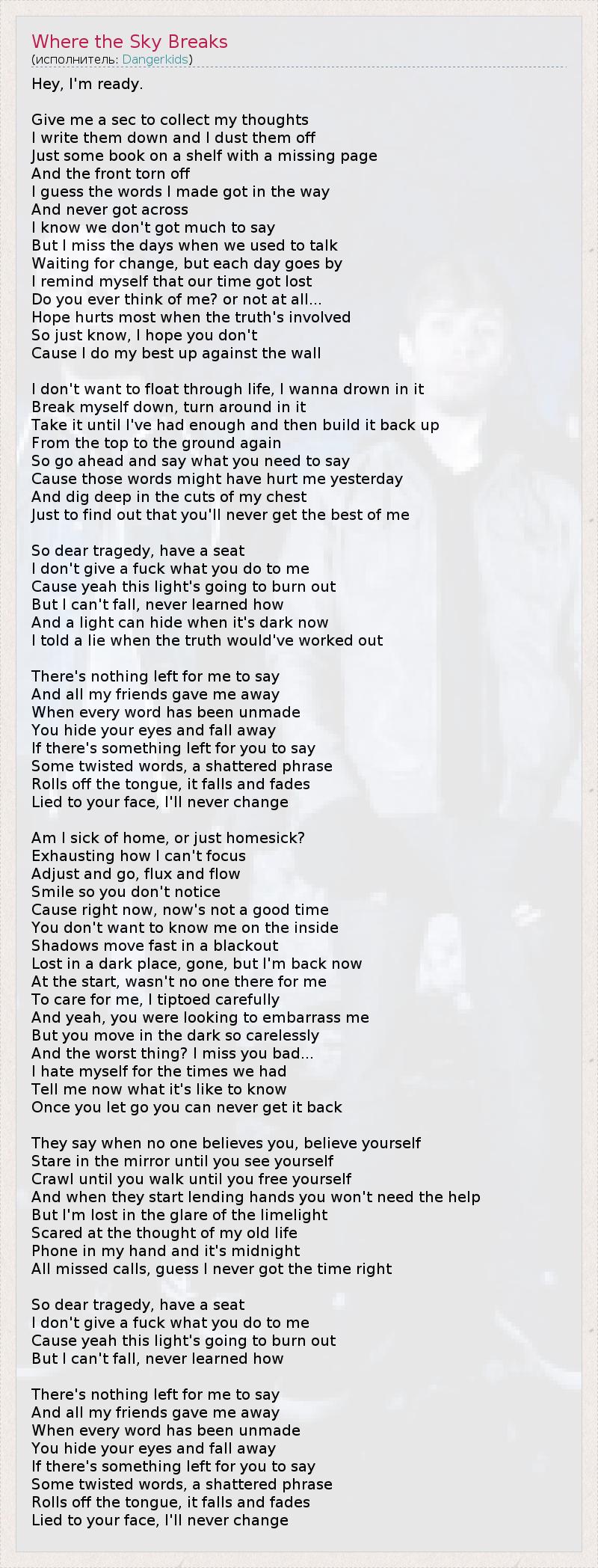 Эй, я готов. Дай мне секунду, чтобы собраться с мыслями, Я записываю их и тут же стираю. Это просто книга на полке с недостающей страницей И оторванной обложкой. Кажется, все слова, что я сочинил, только помешали, Но так и не дошли до сознания. Я знаю, нам почти нечего сказать, Но я скучаю по тем дням, когда мы разговаривали. Жду перемен, но каждый день проходит мимо, Я напоминаю себе, что наше время потеряно. Думаешь ли ты обо мне иногда? Или вообще никогда? Надежда ранит больнее всего, когда дело доходит до правды. Так что знай: я надеюсь, что ты не думаешь обо мне, Ведь я делаю все возможное в безвыходной ситуации. Я не хочу плыть по жизни, я хочу в ней тонуть, Сломать себя, измениться, Терпеть, пока не пойму, что с меня хватит, а затем строить все заново, И снова сверху вниз. Так давай же, скажи то, что должна сказать, Ведь эти слова могли сделать мне больно вчера, Покопайся в моих душевных ранах, Лишь чтобы узнать, что тебе никогда не взять верх надо мной. Ну садись, дорогая трагедия, Мне наплевать, что ты делаешь со мной, Потому что этот свет догорит, Но я не могу упасть, я никогда не умел. А свет может скрываться, когда темно. Я солгал, когда правда могла бы сработать. Мне больше нечего сказать, И все мои друзья меня предали. Теперь, когда все слова переделаны, Ты прячешь глаза и уходишь. Если тебе еще есть что сказать, Какие-то запутанные слова, осколки фраз Слетают с языка - и все рушится и исчезает. Я лгал тебе в глаза, я никогда не изменюсь. Меня тошнит от дома или тянет домой? Изнуряя себя, я не могу сосредоточиться. Приспосабливаюсь, плыву по течению, Улыбаюсь, чтобы ты не заметила, Потому что именно сейчас не самое подходящее время, Тебе лучше не знать, какой я внутри. Тени быстро движутся в затемнении, Я заблудился в темноте, пропал, но вот я вернулся, В самом начале, рядом со мной не было никого, Чтобы позаботиться обо мне, я осторожно шел на цыпочках. А ты пыталась смутить меня, Но ты так небрежно двигаешься в темноте. И что самое худшее – мне так сильно тебя не хватает... Я ненавижу себя за все, что у нас было. Скажи мне теперь, каково это – знать, Что однажды отпустив, ты уже никогда не вернешь? Говорят, когда тебе никто не верит, верь себе, Вглядывайся в зеркало, пока не увидишь себя, Ползи, пока не начнешь ходить, пока не освободишься, И когда они протянут руку, тебе не будет нужна помощь. Но я потерян в ослепительном свете прожекторов, Пугаясь от мысли о моей прежней жизни. Телефон в руке, полночь на часах, Все звонки пропущены - наверное, я никогда не умел выбирать время. Ну садись, дорогая трагедия. Мне наплевать, что ты делаешь со мной, Потому что этот свет погаснет, Но я не могу упасть, я никогда не знал, как это. Мне больше нечего сказать, И все мои друзья меня предали. Теперь, когда все слова переделаны, Ты прячешь глаза и уходишь. Если тебе еще есть что сказать, Какие-то запутанные слова, осколки фраз Слетают с языка, и все рушится и исчезает. Я лгал тебе в глаза, я никогда не изменюсь.