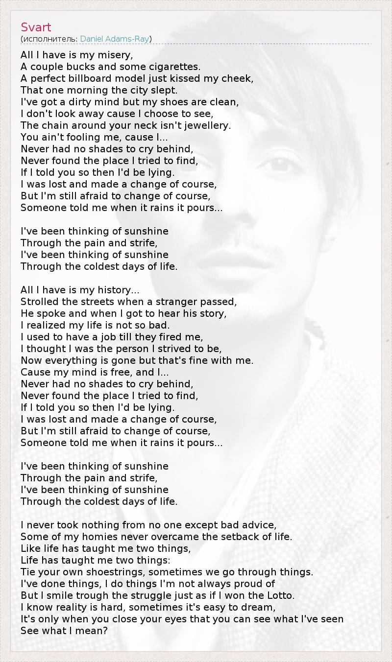 Всё, что у меня есть - мои несчастья, Пара соток в кармане и несколько сигарет. Красавица из рекламы только что поцеловала меня в щеку Этим утром, пока город спал. У меня грязные мысли, но ботинки чистые. Я не поворачиваюсь спиной, потому что понимаю - Цепь на твоей шее - вовсе не украшение. Ты меня не одурачишь, ведь я... Никогда не прятал слёзы в тени, Ни разу ещё не находил то место, что ищу. А если я так сказал бы, это была бы ложь. Я был потерян и изменил курс, Но, конечно же, до сих пор боюсь меняться. Кто-то говорил мне, что беда не приходит одна. А я думал о солнце В несчастье и раздоре. А я думал о солнце Даже в самые холодные дни в моей жизни. Всё, что у меня есть - моя история. Я гулял по улицам, и мне встретился незнакомец. Он заговорил, и когда я узнал его историю, Я понял, что, в сущности, не так уж плохо живу. У меня была работа, пока меня не уволили, И я думал, что был тем, кем стремился быть. Теперь нет ничего, но я не расстраиваюсь, Потому что мой разум свободен, и я... Никогда не прятал слёзы в тени, Ни разу ещё не находил то место, что ищу. А если я так сказал бы, это была бы ложь. Я был потерян и изменил курс, Но, конечно же, до сих пор боюсь меняться. Кто-то говорил мне, что беда не приходит одна. А я думал о солнце В несчастье и раздоре. А я думал о солнце Даже в самые холодные дни в моей жизни. Я никогда ничего ни от кого не принимал, кроме дурных советов. Один из моих корешей не смог справиться с неудачами в этой жизни... А жизнь научила меня двум вещам: Жизнь научила меня двум вещам: Сам завязывай себе шнурки и Иногда мы проходим через испытания. Я совершал и совершаю вещи, которыми не всегда горжусь, Но я продолжаю улыбаться сквозь страдания, будто я выиграл в лотерею. Я знаю, жизнь не сахар, иногда легче помечтать. И только когда закроешь глаза, можешь увидеть то, что видел я. Понимаешь, о чём я?