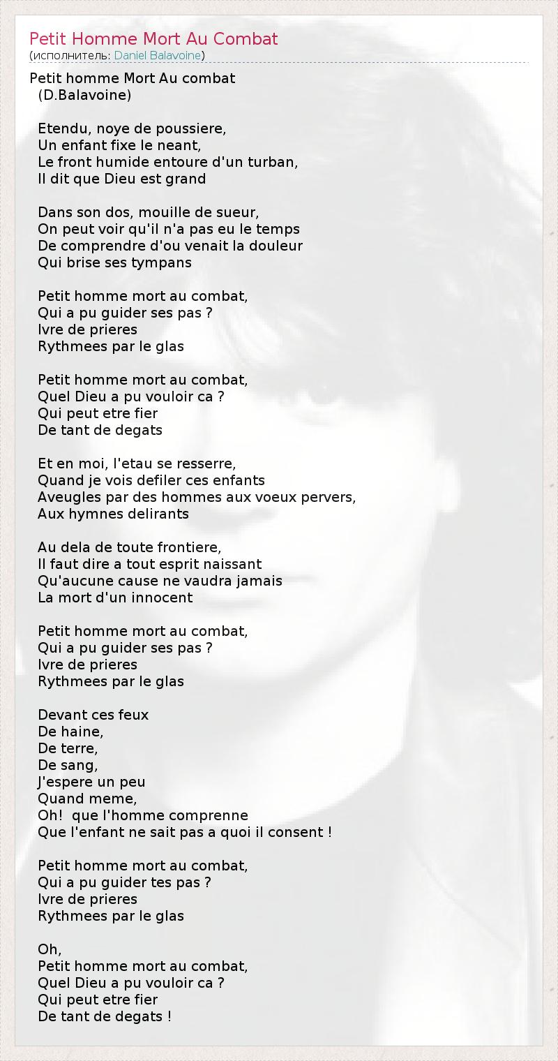 Petit homme Mort Au combat (D.Balavoine) Etendu, noye de poussiere, Un enfant fixe le neant, Le front humide entoure d'un turban, Il dit que Dieu est grand Dans son dos, mouille de sueur, On peut voir qu'il n'a pas eu le temps De comprendre d'ou venait la douleur Qui brise ses tympans Petit homme mort au combat, Qui a pu guider ses pas ? Ivre de prieres Rythmees par le glas Petit homme mort au combat, Quel Dieu a pu vouloir ca ? Qui peut etre fier De tant de degats Et en moi, l'etau se resserre, Quand je vois defiler ces enfants Aveugles par des hommes aux voeux pervers, Aux hymnes delirants Au dela de toute frontiere, Il faut dire a tout esprit naissant Qu'aucune cause ne vaudra jamais La mort d'un innocent Petit homme mort au combat, Qui a pu guider ses pas ? Ivre de prieres Rythmees par le glas Devant ces feux De haine, De terre, De sang, J'espere un peu Quand meme, Oh! que l'homme comprenne Que l'enfant ne sait pas a quoi il consent ! Petit homme mort au combat, Qui a pu guider tes pas ? Ivre de prieres Rythmees par le glas Oh, Petit homme mort au combat, Quel Dieu a pu vouloir ca ? Qui peut etre fier De tant de degats !