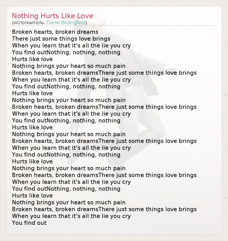 Broken hearts, broken dreams There just some things love brings When you learn that it's all the lie you cry You find outNothing, nothing, nothing Hurts like love Nothing brings your heart so much pain Broken hearts, broken dreamsThere just some things love brings When you learn that it's all the lie you cry You find outNothing, nothing, nothing Hurts like love Nothing brings your heart so much pain Broken hearts, broken dreamsThere just some things love brings When you learn that it's all the lie you cry You find outNothing, nothing, nothing Hurts like love Nothing brings your heart so much pain Broken hearts, broken dreamsThere just some things love brings When you learn that it's all the lie you cry You find outNothing, nothing, nothing Hurts like love Nothing brings your heart so much pain Broken hearts, broken dreamsThere just some things love brings When you learn that it's all the lie you cry You find outNothing, nothing, nothing Hurts like love Nothing brings your heart so much pain Broken hearts, broken dreamsThere just some things love brings When you learn that it's all the lie you cry You find out