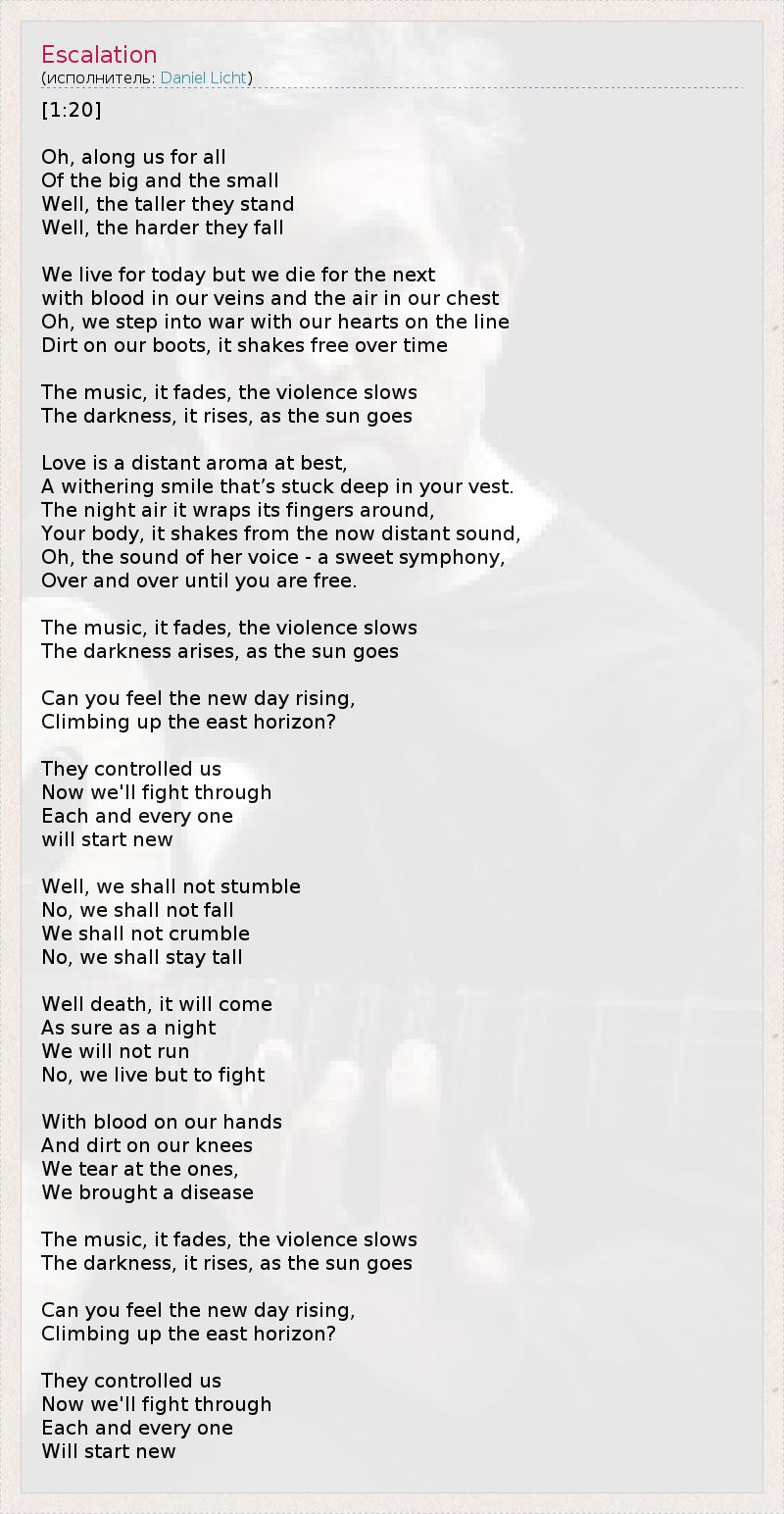 [1:20] Oh, along us for all Of the big and the small Well, the taller they stand Well, the harder they fall We live for today but we die for the next with blood in our veins and the air in our chest Oh, we step into war with our hearts on the line Dirt on our boots, it shakes free over time The music, it fades, the violence slows The darkness, it rises, as the sun goes Love is a distant aroma at best, A withering smile that’s stuck deep in your vest. The night air it wraps its fingers around, Your body, it shakes from the now distant sound, Oh, the sound of her voice - a sweet symphony, Over and over until you are free. The music, it fades, the violence slows The darkness arises, as the sun goes Can you feel the new day rising, Climbing up the east horizon? They controlled us Now we'll fight through Each and every one will start new Well, we shall not stumble No, we shall not fall We shall not crumble No, we shall stay tall Well death, it will come As sure as a night We will not run No, we live but to fight With blood on our hands And dirt on our knees We tear at the ones, We brought a disease The music, it fades, the violence slows The darkness, it rises, as the sun goes Can you feel the new day rising, Climbing up the east horizon? They controlled us Now we'll fight through Each and every one Will start new