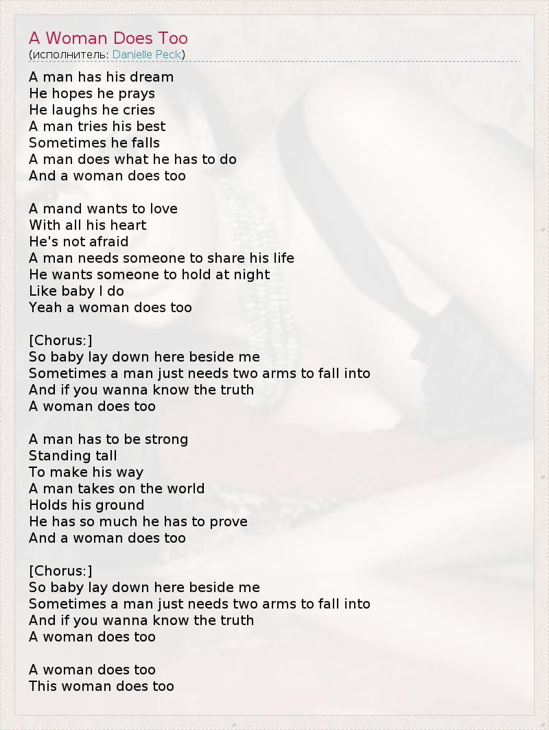 A man has his dream He hopes he prays He laughs he cries A man tries his best Sometimes he falls A man does what he has to do And a woman does too A mand wants to love With all his heart He's not afraid A man needs someone to share his life He wants someone to hold at night Like baby I do Yeah a woman does too [Chorus:] So baby lay down here beside me Sometimes a man just needs two arms to fall into And if you wanna know the truth A woman does too A man has to be strong Standing tall To make his way A man takes on the world Holds his ground He has so much he has to prove And a woman does too [Chorus:] So baby lay down here beside me Sometimes a man just needs two arms to fall into And if you wanna know the truth A woman does too A woman does too This woman does too