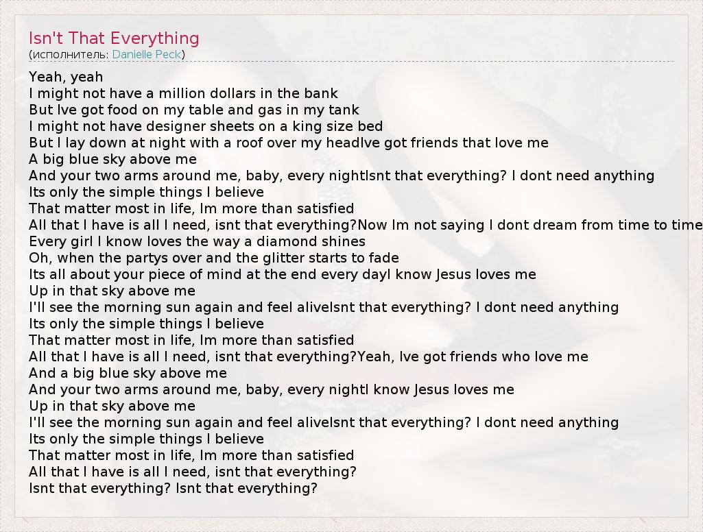 Yeah, yeah I might not have a million dollars in the bank But Ive got food on my table and gas in my tank I might not have designer sheets on a king size bed But I lay down at night with a roof over my headIve got friends that love me A big blue sky above me And your two arms around me, baby, every nightIsnt that everything? I dont need anything Its only the simple things I believe That matter most in life, Im more than satisfied All that I have is all I need, isnt that everything?Now Im not saying I dont dream from time to time Every girl I know loves the way a diamond shines Oh, when the partys over and the glitter starts to fade Its all about your piece of mind at the end every dayI know Jesus loves me Up in that sky above me I'll see the morning sun again and feel aliveIsnt that everything? I dont need anything Its only the simple things I believe That matter most in life, Im more than satisfied All that I have is all I need, isnt that everything?Yeah, Ive got friends who love me And a big blue sky above me And your two arms around me, baby, every nightI know Jesus loves me Up in that sky above me I'll see the morning sun again and feel aliveIsnt that everything? I dont need anything Its only the simple things I believe That matter most in life, Im more than satisfied All that I have is all I need, isnt that everything? Isnt that everything? Isnt that everything?