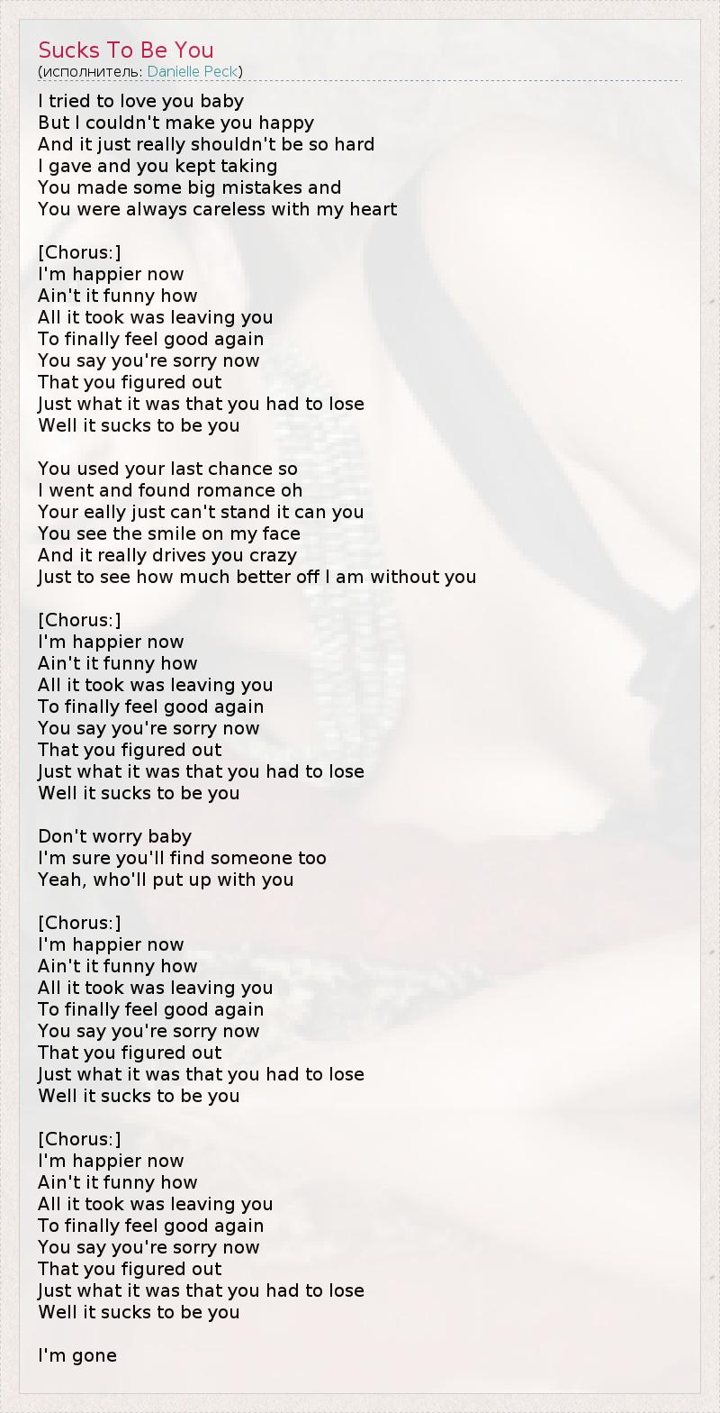 I tried to love you baby But I couldn't make you happy And it just really shouldn't be so hard I gave and you kept taking You made some big mistakes and You were always careless with my heart [Chorus:] I'm happier now Ain't it funny how All it took was leaving you To finally feel good again You say you're sorry now That you figured out Just what it was that you had to lose Well it sucks to be you You used your last chance so I went and found romance oh Your eally just can't stand it can you You see the smile on my face And it really drives you crazy Just to see how much better off I am without you [Chorus:] I'm happier now Ain't it funny how All it took was leaving you To finally feel good again You say you're sorry now That you figured out Just what it was that you had to lose Well it sucks to be you Don't worry baby I'm sure you'll find someone too Yeah, who'll put up with you [Chorus:] I'm happier now Ain't it funny how All it took was leaving you To finally feel good again You say you're sorry now That you figured out Just what it was that you had to lose Well it sucks to be you [Chorus:] I'm happier now Ain't it funny how All it took was leaving you To finally feel good again You say you're sorry now That you figured out Just what it was that you had to lose Well it sucks to be you I'm gone