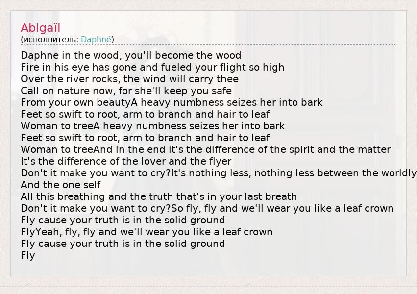 Daphne in the wood, you'll become the wood Fire in his eye has gone and fueled your flight so high Over the river rocks, the wind will carry thee Call on nature now, for she'll keep you safe From your own beautyA heavy numbness seizes her into bark Feet so swift to root, arm to branch and hair to leaf Woman to treeA heavy numbness seizes her into bark Feet so swift to root, arm to branch and hair to leaf Woman to treeAnd in the end it's the difference of the spirit and the matter It's the difference of the lover and the flyer Don't it make you want to cry?It's nothing less, nothing less between the worldly And the one self All this breathing and the truth that's in your last breath Don't it make you want to cry?So fly, fly and we'll wear you like a leaf crown Fly cause your truth is in the solid ground FlyYeah, fly, fly and we'll wear you like a leaf crown Fly cause your truth is in the solid ground Fly