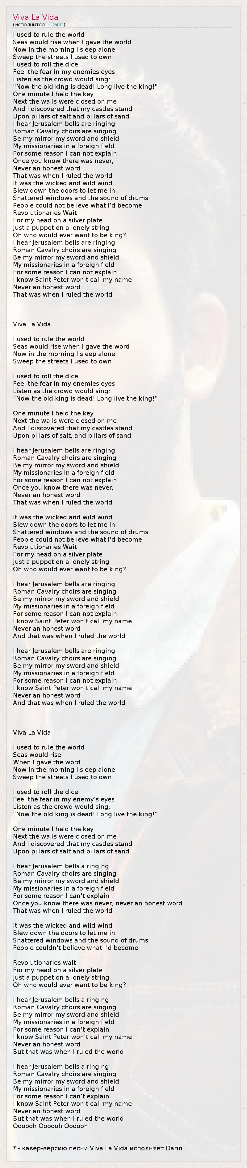 I used to rule the world Seas would rise when I gave the world Now in the morning I sleep alone Sweep the streets I used to own I used to roll the dice Feel the fear in my enemies eyes Listen as the crowd would sing: "Now the old king is dead! Long live the king!" One minute I held the key Next the walls were closed on me And I discovered that my castles stand Upon pillars of salt and pillars of sand I hear Jerusalem bells are ringing Roman Cavalry choirs are singing Be my mirror my sword and shield My missionaries in a foreign field For some reason I can not explain Once you know there was never, Never an honest word That was when I ruled the world It was the wicked and wild wind Blew down the doors to let me in. Shattered windows and the sound of drums People could not believe what I'd become Revolutionaries Wait For my head on a silver plate Just a puppet on a lonely string Oh who would ever want to be king? I hear Jerusalem bells are ringing Roman Cavalry choirs are singing Be my mirror my sword and shield My missionaries in a foreign field For some reason I can not explain I know Saint Peter won't call my name Never an honest word That was when I ruled the world Viva La Vida I used to rule the world Seas would rise when I gave the word Now in the morning I sleep alone Sweep the streets I used to own I used to roll the dice Feel the fear in my enemies eyes Listen as the crowd would sing: "Now the old king is dead! Long live the king!" One minute I held the key Next the walls were closed on me And I discovered that my castles stand Upon pillars of salt, and pillars of sand I hear Jerusalem bells are ringing Roman Cavalry choirs are singing Be my mirror my sword and shield My missionaries in a foreign field For some reason I can not explain Once you know there was never, Never an honest word That was when I ruled the world It was the wicked and wild wind Blew down the doors to let me in. Shattered windows and the sound of drums People could not believe what I'd become Revolutionaries Wait For my head on a silver plate Just a puppet on a lonely string Oh who would ever want to be king? I hear Jerusalem bells are ringing Roman Cavalry choirs are singing Be my mirror my sword and shield My missionaries in a foreign field For some reason I can not explain I know Saint Peter won't call my name Never an honest word And that was when I ruled the world I hear Jerusalem bells are ringing Roman Cavalry choirs are singing Be my mirror my sword and shield My missionaries in a foreign field For some reason I can not explain I know Saint Peter won't call my name Never an honest word And that was when I ruled the world Viva La Vida I used to rule the world Seas would rise When I gave the word Now in the morning I sleep alone Sweep the streets I used to own I used to roll the dice Feel the fear in my enemy's eyes Listen as the crowd would sing: "Now the old king is dead! Long live the king!" One minute I held the key Next the walls were closed on me And I discovered that my castles stand Upon pillars of salt and pillars of sand I hear Jerusalem bells a ringing Roman Cavalry choirs are singing Be my mirror my sword and shield My missionaries in a foreign field For some reason I can't explain Once you know there was never, never an honest word That was when I ruled the world It was the wicked and wild wind Blew down the doors to let me in. Shattered windows and the sound of drums People couldn't believe what I'd become Revolutionaries wait For my head on a silver plate Just a puppet on a lonely string Oh who would ever want to be king? I hear Jerusalem bells a ringing Roman Cavalry choirs are singing Be my mirror my sword and shield My missionaries in a foreign field For some reason I can't explain I know Saint Peter won't call my name Never an honest word But that was when I ruled the world I hear Jerusalem bells a ringing Roman Cavalry choirs are singing Be my mirror my sword and shield My missionaries in a foreign field For some reason I can't explain I know Saint Peter won't call my name Never an honest word But that was when I ruled the world Oooooh Oooooh Oooooh * - кавер-версию песни Viva La Vida исполняет Darin