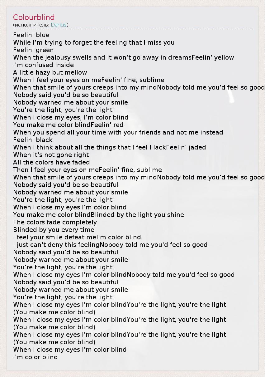 When I close my eyes I'm color blindNobody told me you'd feel so good