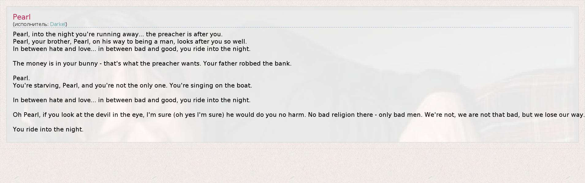 Pearl, into the night you're running away... the preacher is after you. Pearl, your brother, Pearl, on his way to being a man, looks after you so well. In between hate and love... in between bad and good, you ride into the night. The money is in your bunny - that's what the preacher wants. Your father robbed the bank. Pearl. You're starving, Pearl, and you're not the only one. You're singing on the boat. In between hate and love... in between bad and good, you ride into the night. Oh Pearl, if you look at the devil in the eye, I'm sure (oh yes I'm sure) he would do you no harm. No bad religion there - only bad men. We're not, we are not that bad, but we lose our way. You ride into the night.