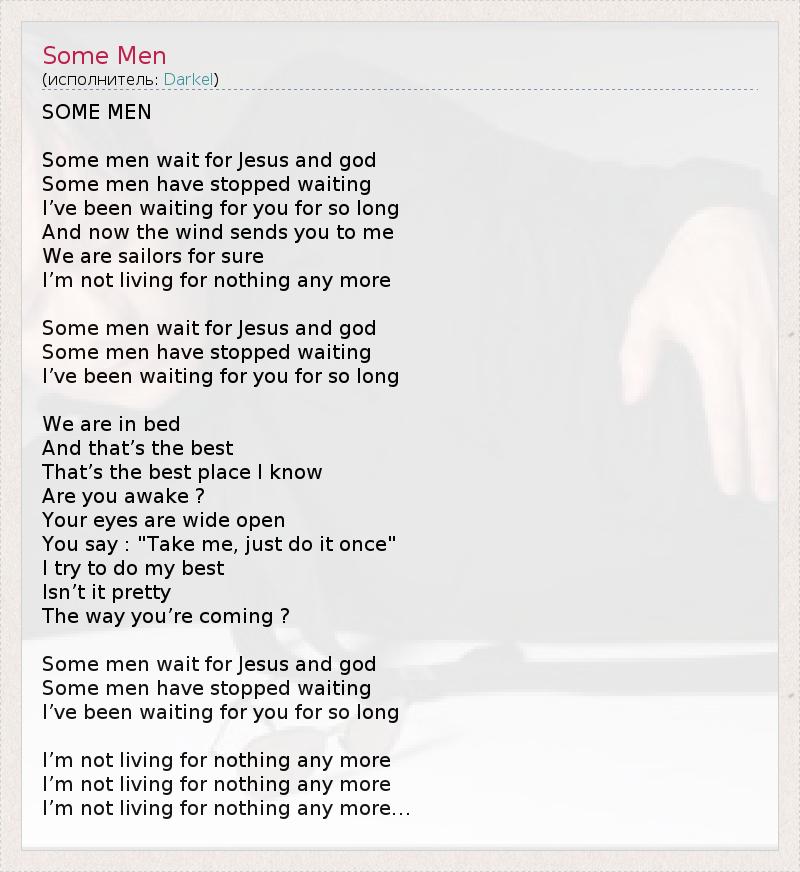 SOME MEN Some men wait for Jesus and god Some men have stopped waiting I’ve been waiting for you for so long And now the wind sends you to me We are sailors for sure I’m not living for nothing any more Some men wait for Jesus and god Some men have stopped waiting I’ve been waiting for you for so long We are in bed And that’s the best That’s the best place I know Are you awake ? Your eyes are wide open You say : "Take me, just do it once" I try to do my best Isn’t it pretty The way you’re coming ? Some men wait for Jesus and god Some men have stopped waiting I’ve been waiting for you for so long I’m not living for nothing any more I’m not living for nothing any more I’m not living for nothing any more…