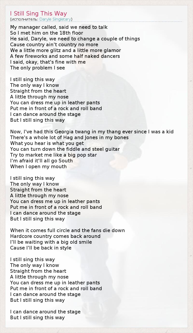 My manager called, said we need to talk So I met him on the 18th floor He said, Daryle, we need to change a couple of things Cause country ain't country no more We a little more glitz and a little more glamor A few fireworks and some half naked dancers I said, okay, that's fine with me The only problem I see I still sing this way The only way I know Straight from the heart A little through my nose You can dress me up in leather pants Put me in front of a rock and roll band I can dance around the stage But I still sing this way Now, I've had this Georgia twang in my thang ever since I was a kid There's a whole lot of Hag and Jones in my bones What you hear is what you get You can turn down the fiddle and steel guitar Try to market me like a big pop star I'm afraid it'll all go South When I open my mouth I still sing this way The only way I know Straight from the heart A little through my nose You can dress me up in leather pants Put me in front of a rock and roll band I can dance around the stage But I still sing this way When it comes full circle and the fans die down Hardcore country comes back around I'll be waiting with a big old smile Cause I'll be back in style I still sing this way The only way I know Straight from the heart A little through my nose You can dress me up in leather pants Put me in front of a rock and roll band I can dance around the stage But I still sing this way I can dance around the stage But I still sing this way
