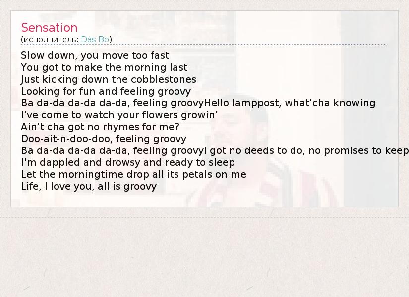 Ba da-da da-da da-da, feeling groovyI got no deeds to do, no promises to keep