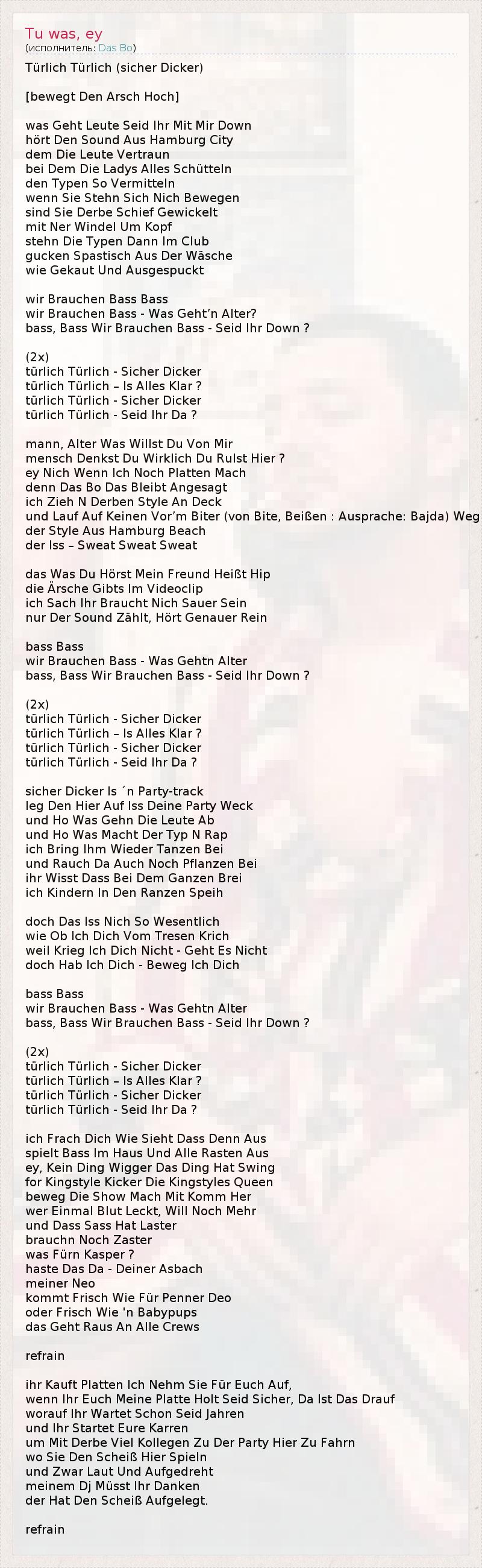 Türlich Türlich (sicher Dicker) [bewegt Den Arsch Hoch] was Geht Leute Seid Ihr Mit Mir Down hört Den Sound Aus Hamburg City dem Die Leute Vertraun bei Dem Die Ladys Alles Schütteln den Typen So Vermitteln wenn Sie Stehn Sich Nich Bewegen sind Sie Derbe Schief Gewickelt mit Ner Windel Um Kopf stehn Die Typen Dann Im Club gucken Spastisch Aus Der Wäsche wie Gekaut Und Ausgespuckt wir Brauchen Bass Bass wir Brauchen Bass - Was Geht’n Alter? bass, Bass Wir Brauchen Bass - Seid Ihr Down ? (2x) türlich Türlich - Sicher Dicker türlich Türlich – Is Alles Klar ? türlich Türlich - Sicher Dicker türlich Türlich - Seid Ihr Da ? mann, Alter Was Willst Du Von Mir mensch Denkst Du Wirklich Du Rulst Hier ? ey Nich Wenn Ich Noch Platten Mach denn Das Bo Das Bleibt Angesagt ich Zieh N Derben Style An Deck und Lauf Auf Keinen Vor’m Biter (von Bite, Beißen : Ausprache: Bajda) Weg der Style Aus Hamburg Beach der Iss – Sweat Sweat Sweat das Was Du Hörst Mein Freund Heißt Hip die Ärsche Gibts Im Videoclip ich Sach Ihr Braucht Nich Sauer Sein nur Der Sound Zählt, Hört Genauer Rein bass Bass wir Brauchen Bass - Was Gehtn Alter bass, Bass Wir Brauchen Bass - Seid Ihr Down ? (2x) türlich Türlich - Sicher Dicker türlich Türlich – Is Alles Klar ? türlich Türlich - Sicher Dicker türlich Türlich - Seid Ihr Da ? sicher Dicker Is ´n Party-track leg Den Hier Auf Iss Deine Party Weck und Ho Was Gehn Die Leute Ab und Ho Was Macht Der Typ N Rap ich Bring Ihm Wieder Tanzen Bei und Rauch Da Auch Noch Pflanzen Bei ihr Wisst Dass Bei Dem Ganzen Brei ich Kindern In Den Ranzen Speih doch Das Iss Nich So Wesentlich wie Ob Ich Dich Vom Tresen Krich weil Krieg Ich Dich Nicht - Geht Es Nicht doch Hab Ich Dich - Beweg Ich Dich bass Bass wir Brauchen Bass - Was Gehtn Alter bass, Bass Wir Brauchen Bass - Seid Ihr Down ? (2x) türlich Türlich - Sicher Dicker türlich Türlich – Is Alles Klar ? türlich Türlich - Sicher Dicker türlich Türlich - Seid Ihr Da ? ich Frach Dich Wie Sieht Dass Denn Aus spielt Bass Im Haus Und Alle Rasten Aus ey, Kein Ding Wigger Das Ding Hat Swing for Kingstyle Kicker Die Kingstyles Queen beweg Die Show Mach Mit Komm Her wer Einmal Blut Leckt, Will Noch Mehr und Dass Sass Hat Laster brauchn Noch Zaster was Fürn Kasper ? haste Das Da - Deiner Asbach meiner Neo kommt Frisch Wie Für Penner Deo oder Frisch Wie 'n Babypups das Geht Raus An Alle Crews refrain ihr Kauft Platten Ich Nehm Sie Für Euch Auf, wenn Ihr Euch Meine Platte Holt Seid Sicher, Da Ist Das Drauf worauf Ihr Wartet Schon Seid Jahren und Ihr Startet Eure Karren um Mit Derbe Viel Kollegen Zu Der Party Hier Zu Fahrn wo Sie Den Scheiß Hier Spieln und Zwar Laut Und Aufgedreht meinem Dj Müsst Ihr Danken der Hat Den Scheiß Aufgelegt. refrain