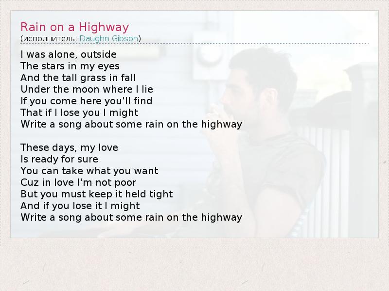 I was alone, outside The stars in my eyes And the tall grass in fall Under the moon where I lie If you come here you'll find That if I lose you I might Write a song about some rain on the highway These days, my love Is ready for sure You can take what you want Cuz in love I'm not poor But you must keep it held tight And if you lose it I might Write a song about some rain on the highway