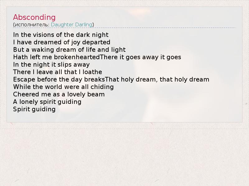 Это интересно:Daughter Darling – американский трип-хоп коллектив, состоящий из вокалистки Натали Уолкер и продюсеров Трэвиса и Стивена Фогелманов.Проживающие в Филадельфии братья Трэвис и Стивен работали с хип-хоп артистами более 10 лет до образования Daughter Darling. Стивен заболел хип-хопом в возрасте 13 лет, а его младший брат Трэвис начал эксперименты с сэмплированием и созданием композиций в стиле драм-н-бейс... продолжение