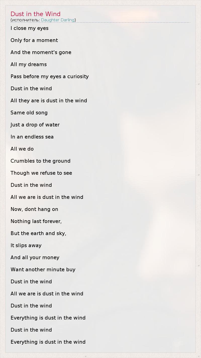 I close my eyes Only for a moment And the moment's gone All my dreams Pass before my eyes a curiosity Dust in the wind All they are is dust in the wind Same old song Just a drop of water In an endless sea All we do Crumbles to the ground Though we refuse to see Dust in the wind All we are is dust in the wind Now, dont hang on Nothing last forever, But the earth and sky, It slips away And all your money Want another minute buy Dust in the wind All we are is dust in the wind Dust in the wind Everything is dust in the wind Dust in the wind Everything is dust in the wind