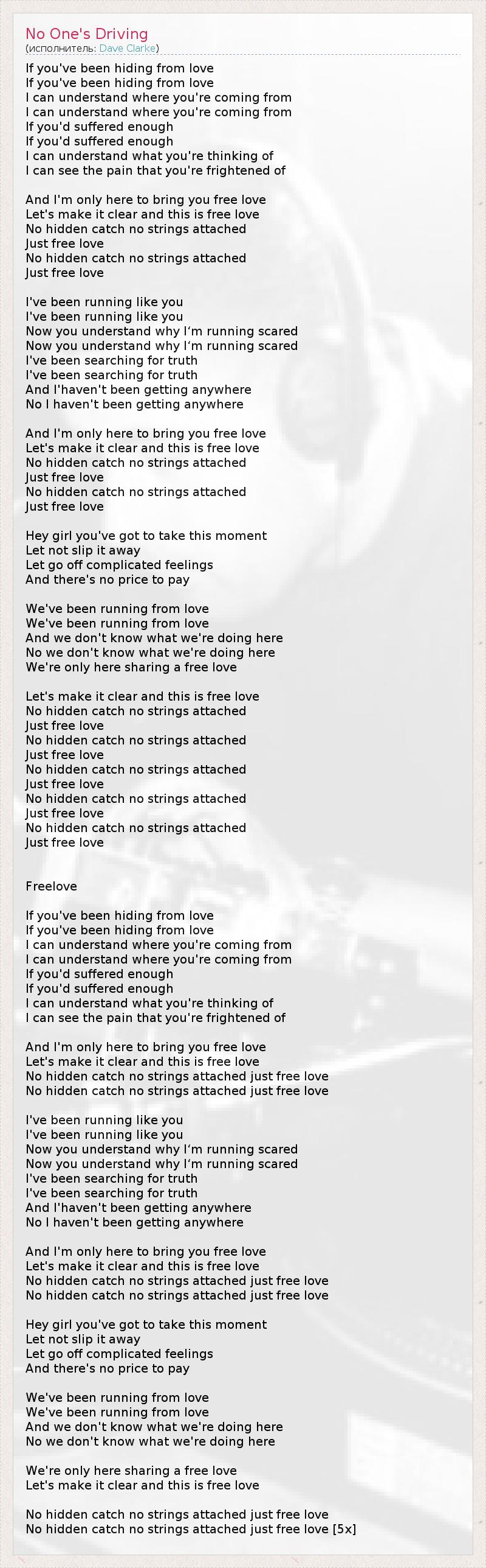 Если ты пряталась от любви, Если ты пряталась от любви, Я могу понять, откуда ты идёшь. Я могу понять, откуда ты идёшь. Если ты достаточно страдала, Если ты достаточно страдала, Я могу понять, о чём ты думаешь, Я могу видеть боль, которой ты боишься. И я здесь только для того, чтобы подарить тебе свободную любовь. Давай проясним: это свободная любовь Никаких скрытых ловушек, никаких цепей. Только свободная любовь. Никаких скрытых ловушек, никаких цепей. Только свободная любовь. Я бежал, как и ты, Я бежал, как и ты. Теперь ты понимаешь, почему я бегу такой испуганный, Теперь ты понимаешь, почему я бегу такой испуганный. Я искал правду Я искал правду И я не пришёл ни к какому ответу. Нет, я не пришёл ни к какому ответу. И я здесь только для того, чтобы подарить тебе свободную любовь. Давай проясним: это свободная любовь Никаких скрытых ловушек, никаких цепей. Только свободная любовь. Никаких скрытых ловушек, никаких цепей. Только свободная любовь. Эй, девочка, ты должна использовать этот момент. Не упускай его. Отпусти эти сложные чувства, И платить за это не придётся. Мы бежали от любви, Мы бежали от любви. И мы не знаем, что мы здесь делаем, Нет, мы не знаем, что мы здесь делаем. Мы здесь только для того, чтобы разделить свободную любовь Давай проясним: это свободная любовь. Никаких скрытых ловушек, никаких цепей. Только свободная любовь. Никаких скрытых ловушек, никаких цепей. Только свободная любовь. Никаких скрытых ловушек, никаких цепей. Только свободная любовь. Никаких скрытых ловушек, никаких цепей. Только свободная любовь. Никаких скрытых ловушек, никаких цепей. Только свободная любовь. Свободная любовь (перевод Натальи Павловны из С-Петербурга) Если прячешься ты от любви, Если прячешься ты от любви, Я могу понять, откуда пришла ты, Я могу понять, откуда пришла ты, Если достаточно ты настрадалась, Если достаточно ты настрадалась, Я могу понять, о чём ты замечталась, Я вижу боль, которую ты так боялась. И только я здесь, чтобы принести тебе свободную любовь. Давай сделаем её чистой вновь. Никаких уловок, никаких цепей Свободная любовь превыше всех идей. Как и ты, я бежал Как и ты, я бежал Понимаешь теперь, почему я испуганный был? Понимаешь теперь, почему я испуганный был? Я правду искал Я правду искал Но ответ я не нашёл Нет, ответ я, увы, не нашёл. И только я здесь, чтобы принести тебе свободную любовь. Давай сделаем её чистой вновь. Никаких уловок, никаких цепей Свободная любовь превыше всех идей. Эй, девочка, ты должна использовать этот момент. Не упускай его. Эти сложные чувства оставь, И платить за это не придётся. Мы бежали от любви, Мы бежали от любви, И не знаем, что делаем здесь мы, И не знаем, что делаем здесь мы, И только мы здесь, чтобы разделить свободную любовь Давай сделаем её чистой вновь. Никаких уловок, никаких цепей Свободная любовь превыше всех идей [5x]