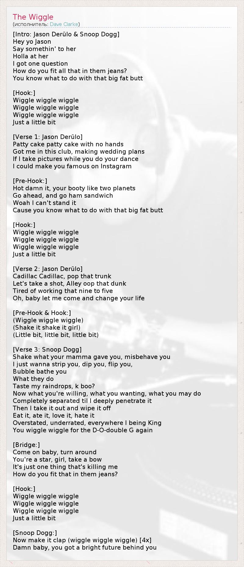 [Intro: Jason Derülo & Snoop Dogg] Hey yo Jason Say somethin' to her Holla at her I got one question How do you fit all that in them jeans? You know what to do with that big fat butt [Hook:] Wiggle wiggle wiggle Wiggle wiggle wiggle Wiggle wiggle wiggle Just a little bit [Verse 1: Jason Derülo] Patty cake patty cake with no hands Got me in this club, making wedding plans If I take pictures while you do your dance I could make you famous on Instagram [Pre-Hook:] Hot damn it, your booty like two planets Go ahead, and go ham sandwich Woah I can't stand it Cause you know what to do with that big fat butt [Hook:] Wiggle wiggle wiggle Wiggle wiggle wiggle Wiggle wiggle wiggle Just a little bit [Verse 2: Jason Derülo] Cadillac Cadillac, pop that trunk Let's take a shot, Alley oop that dunk Tired of working that nine to five Oh, baby let me come and change your life [Pre-Hook & Hook:] (Wiggle wiggle wiggle) (Shake it shake it girl) (Little bit, little bit, little bit) [Verse 3: Snoop Dogg] Shake what your mamma gave you, misbehave you I just wanna strip you, dip you, flip you, Bubble bathe you What they do Taste my raindrops, k boo? Now what you're willing, what you wanting, what you may do Completely separated til I deeply penetrate it Then I take it out and wipe it off Eat it, ate it, love it, hate it Overstated, underrated, everywhere I being King You wiggle wiggle for the D-O-double G again [Bridge:] Come on baby, turn around You're a star, girl, take a bow It's just one thing that's killing me How do you fit that in them jeans? [Hook:] Wiggle wiggle wiggle Wiggle wiggle wiggle Wiggle wiggle wiggle Just a little bit [Snoop Dogg:] Now make it clap (wiggle wiggle wiggle) [4x] Damn baby, you got a bright future behind you